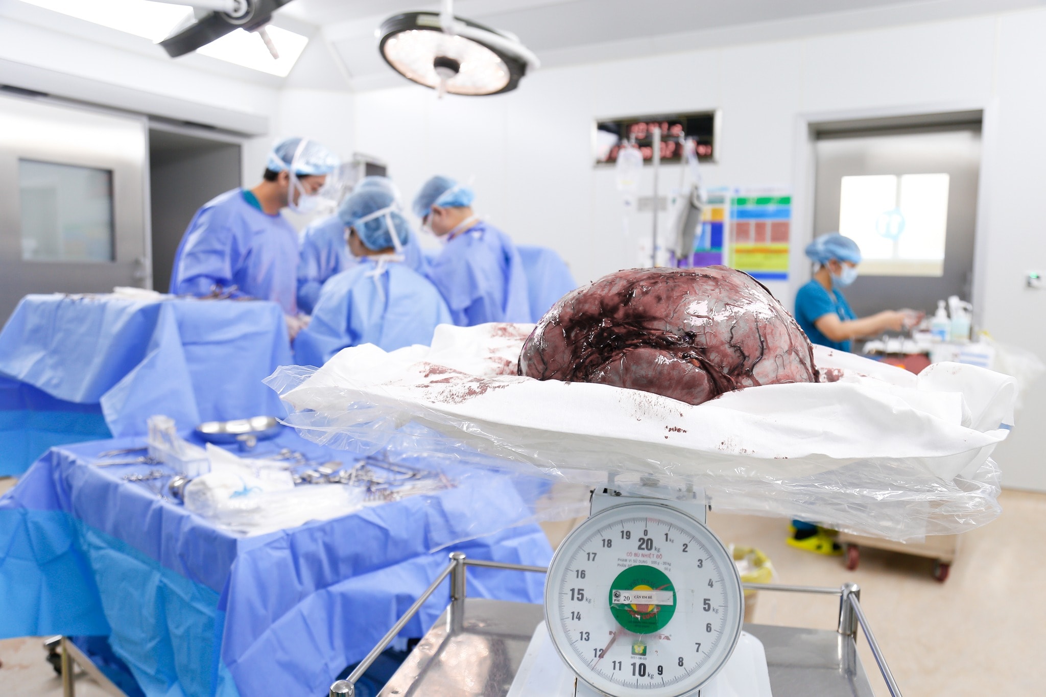Khối u xơ tử cung khổng lồ gần 12kg được lấy ra trong người bệnh nhân. Ảnh: BVCC
