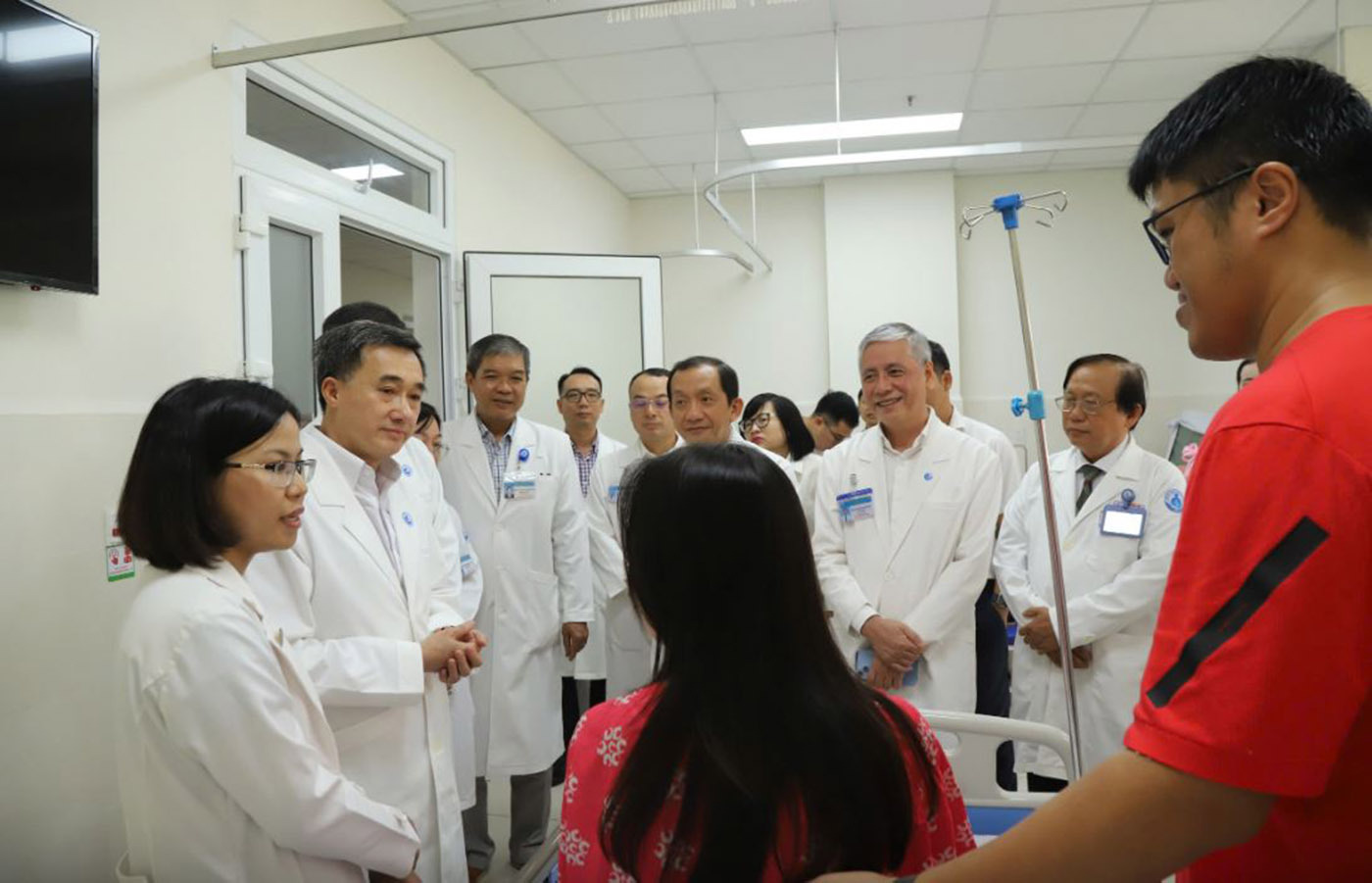 GS.TS Trần Văn Thuấn - Thứ trưởng Bộ Y tế tới chúc mừng bệnh viện và gia đình bệnh nhân sau khi thực hiện can thiệp thông tim thành công (Ảnh: BVCC)