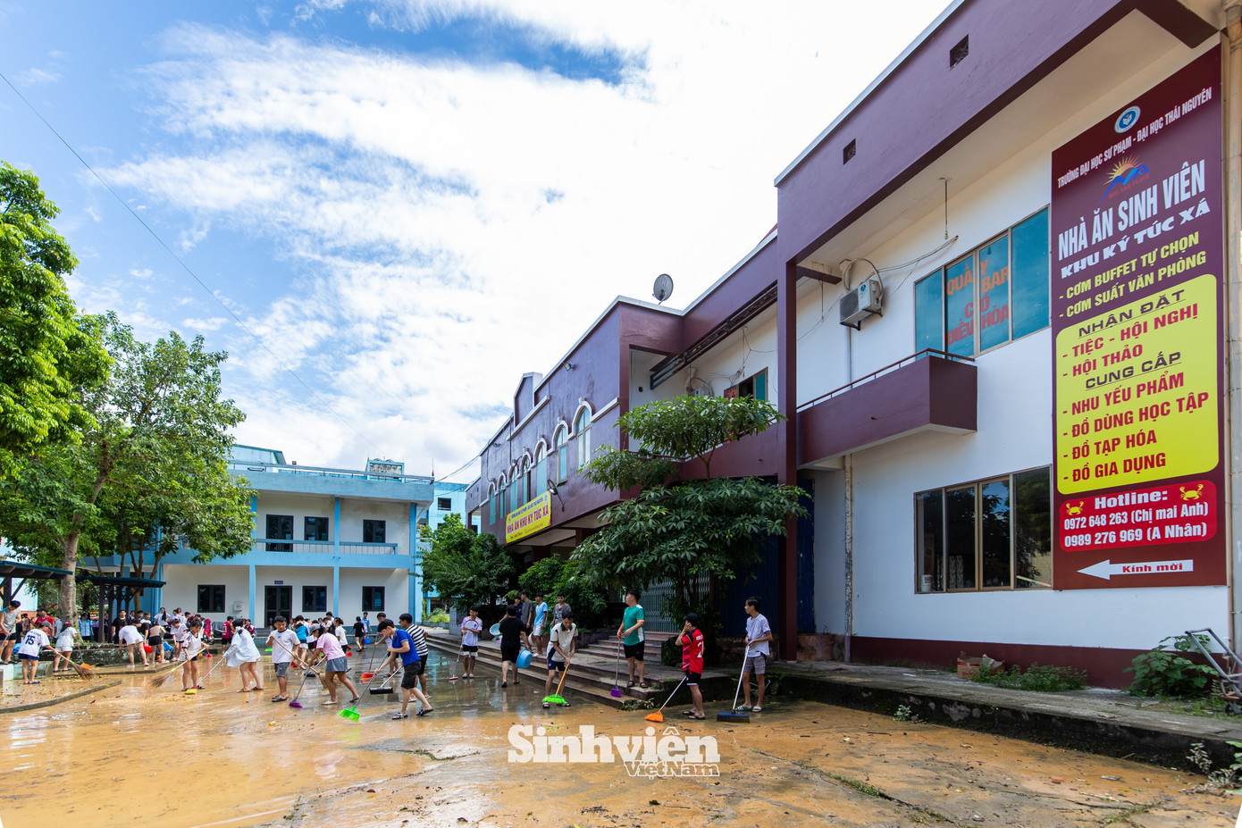 Sinh viên dọn dẹp khuôn viên ký túc xá khi nước rút.