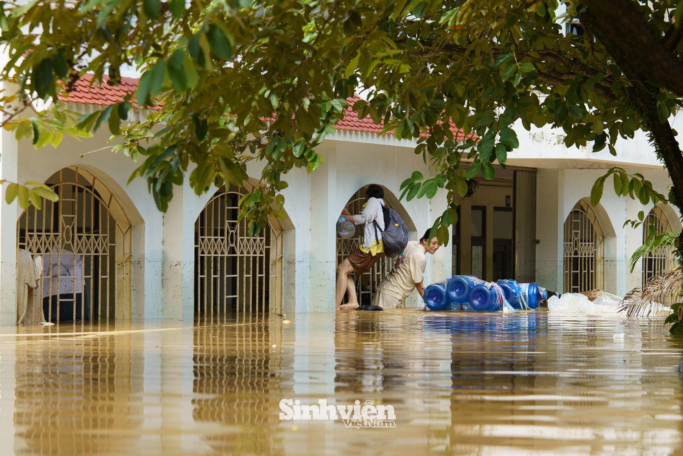 Là sinh viên năm thứ tư, bạn Vy chia sẻ dù đã quen với cảnh ngập lụt nhưng trận lũ này vẫn vượt ngoài sức tưởng tượng. "Chiều 7/10 nước bắt đầu ngập tại khu vực cổng và khuôn viên trường, đến trưa thì tràn vào phòng. Tụi em đã chủ động kê cao đồ đạc, mua đồ ăn dự trữ và một số bạn chuyển lên tầng hai. Nhưng không thể ngờ là đến tối, nước dâng cao và ngập quá nhanh, chỗ sâu phải hơn 2m," Vy kể lại.