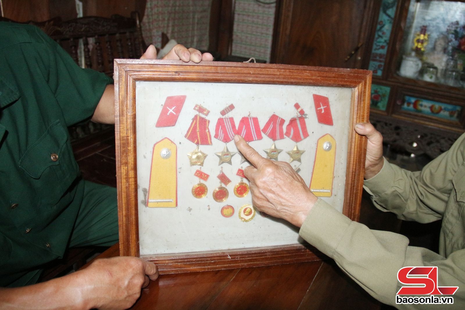 Cựu chiến binh Lò Văn Chới, xã Mường Chiên giới thiệu các phần thưởng cao quý được Đảng, Nhà nước trao tặng.