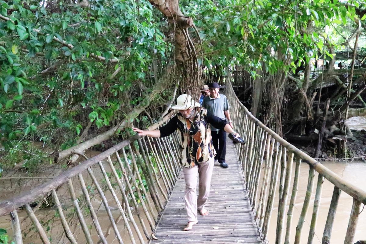 Bây giờ, con đường 40 cây số từ Buôn Ma Thuột đến Buôn Đôn êm ái và rất đẹp. Xe đến thẳng một trong những bãi giữ xe của nhà dân, và tranh thủ chụp ảnh lưu niệm ở tảng đá ghi chữ “Trung tâm du lịch Buôn Đôn”. Rồi sau đó? Có thể thuê chiếc xe điện chạy quanh để thăm các làng hoặc mua vé vào cửa để đi cầu treo vào đảo Voi. Những chiếc cầu treo làm bằng tre nứa lắc lư theo bước chân khách, len giữa những tán cây cổ thụ – là cảm giác chông chênh. Ngay ở giữa cầu treo có khu vực bán thức ăn; khi qua cầu treo thì có mô hình ba con voi giả cho khách chụp ảnh.Còn dòng sông Sêrêpôk mùa mưa nước chảy xiết, màu vàng đục chỉ để ngắm nhìn. Khi qua đảo Voi, có hai con voi ở tận cuối để khách chụp hình, và chỉ có thế. Cầu treo để lòng chao nghiêng.