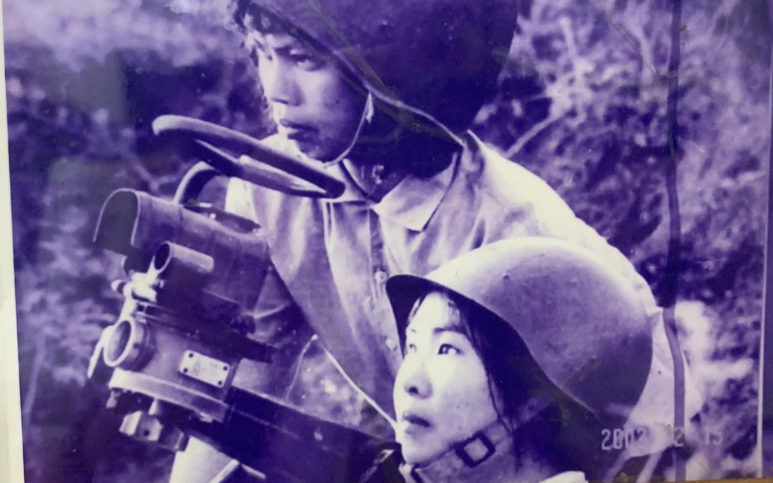 Bà Viễn ngồi dưới) đang nhìn vào thước ngắm của pháo phòng không