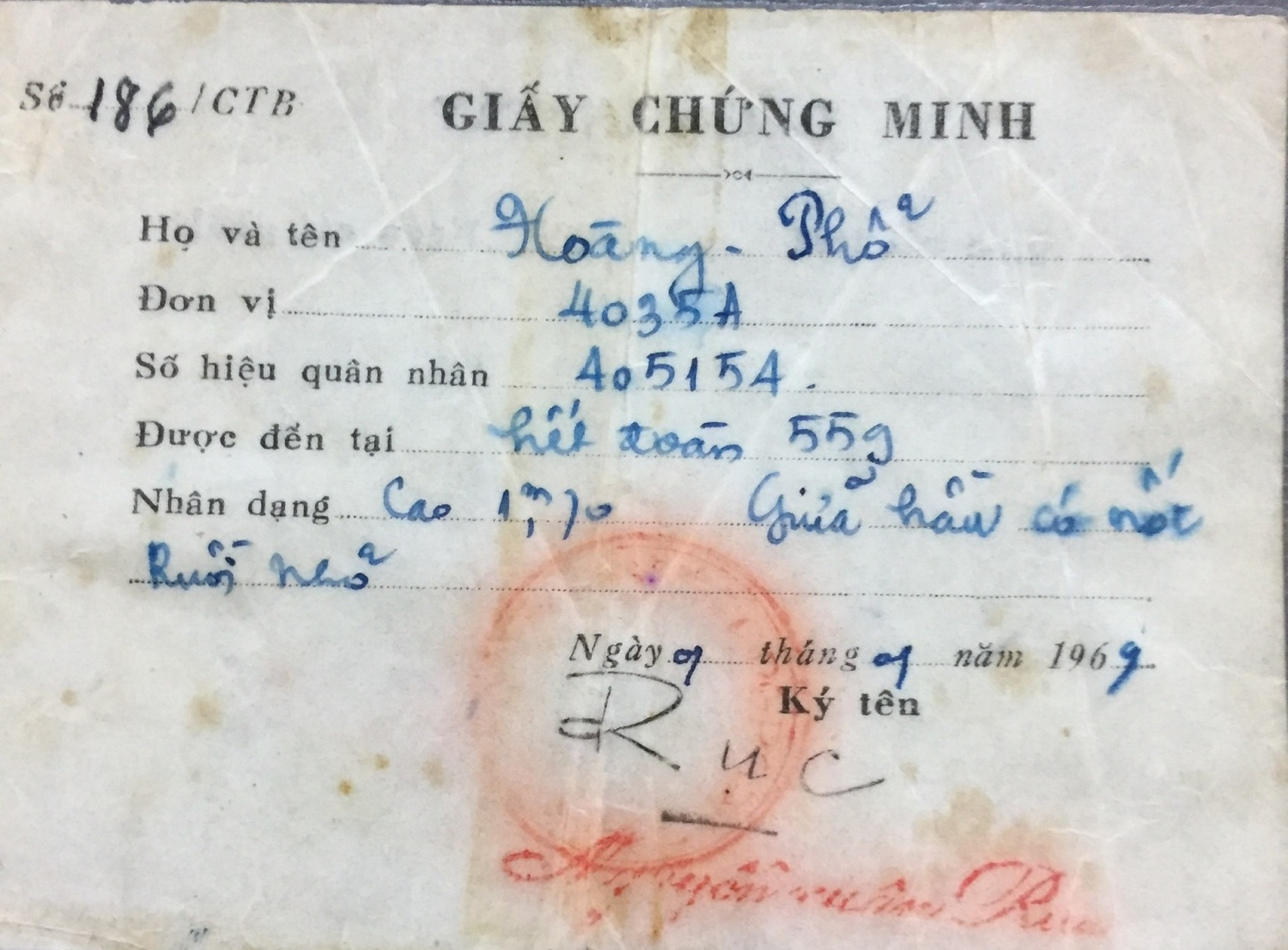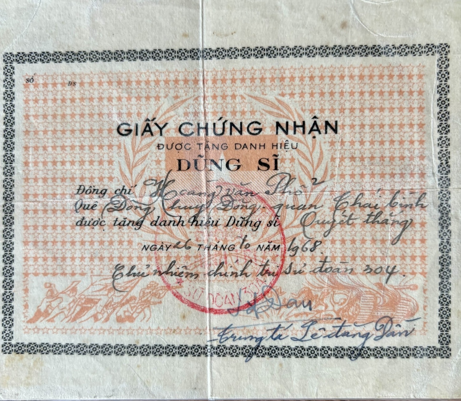 Giấy chứng nhận danh hiệu "Dũng sĩ" của ông Hoàng Phổ.