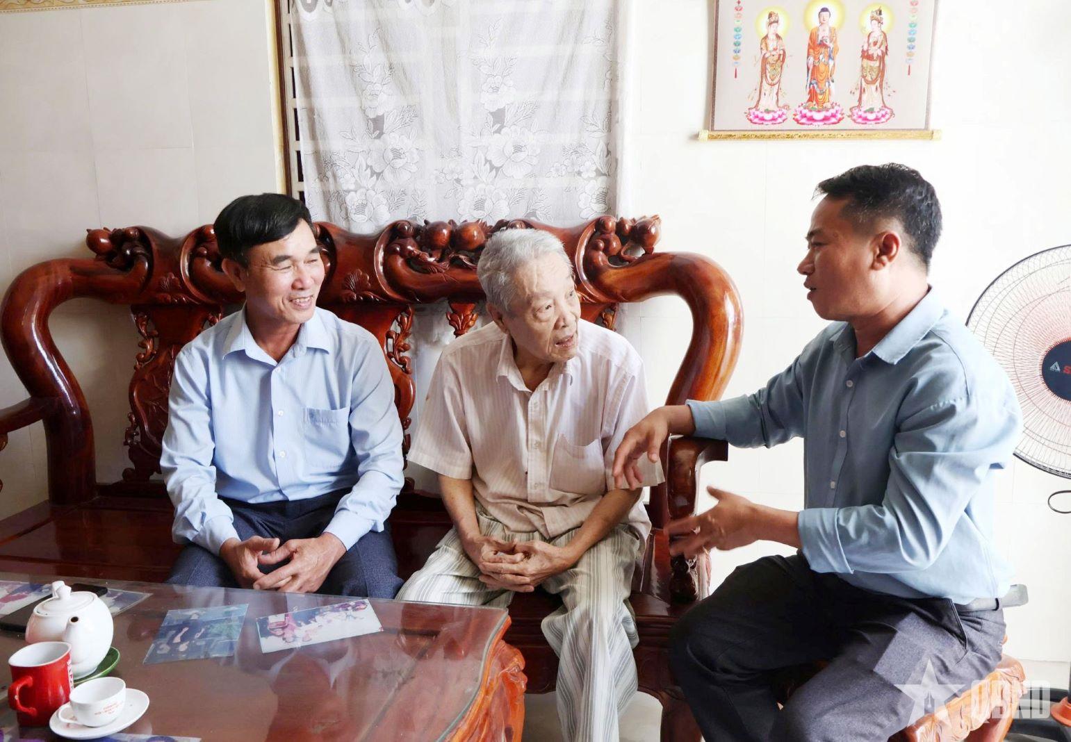 Cựu chiến binh Nguyễn Trọng Nghĩa (ngồi giữa) trò chuyện cùng với cán bộ Hội Cựu chiến binh phường Đô Vinh (Khánh Hòa) về những ngày tháng Tư lịch sử.