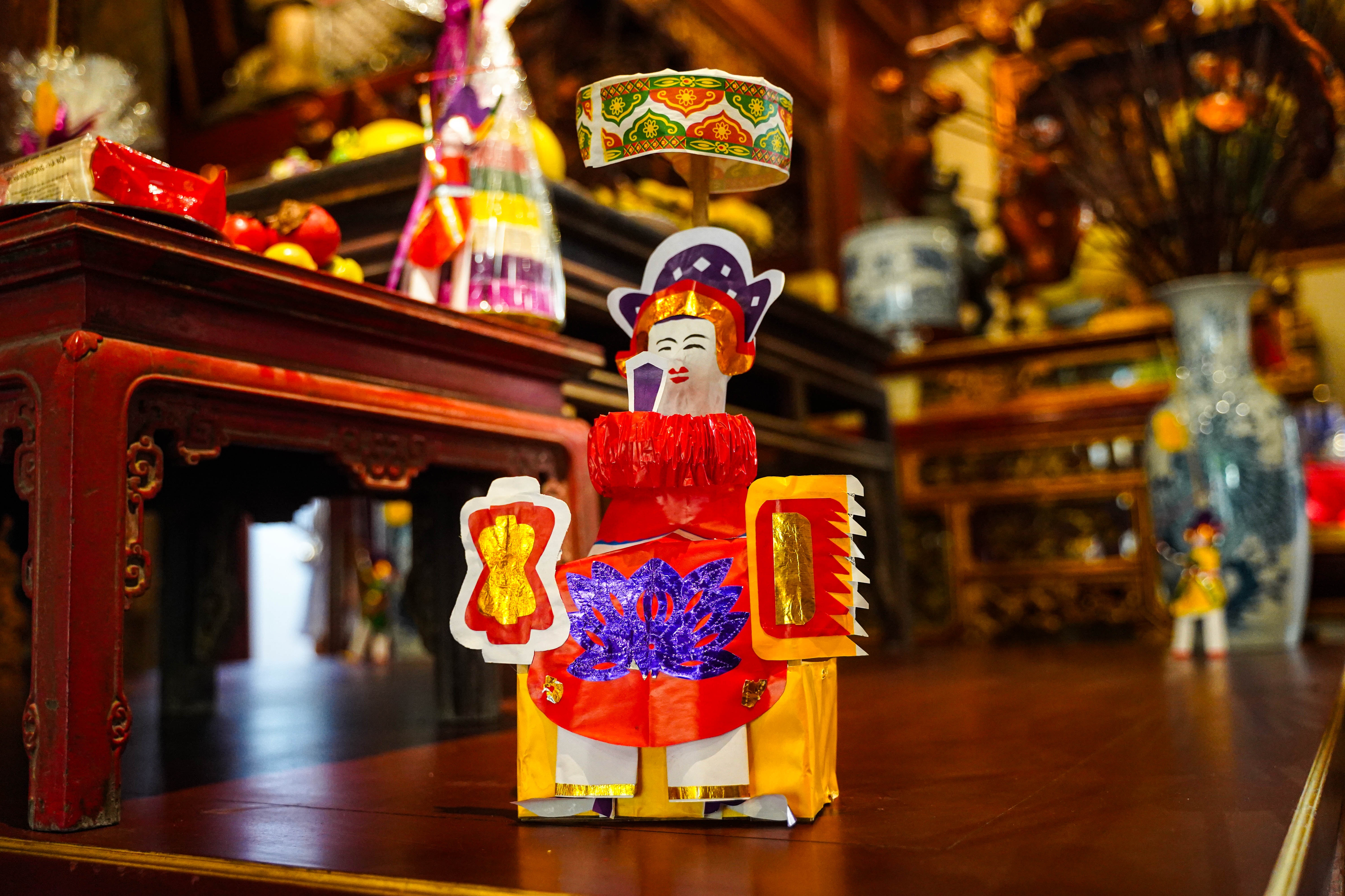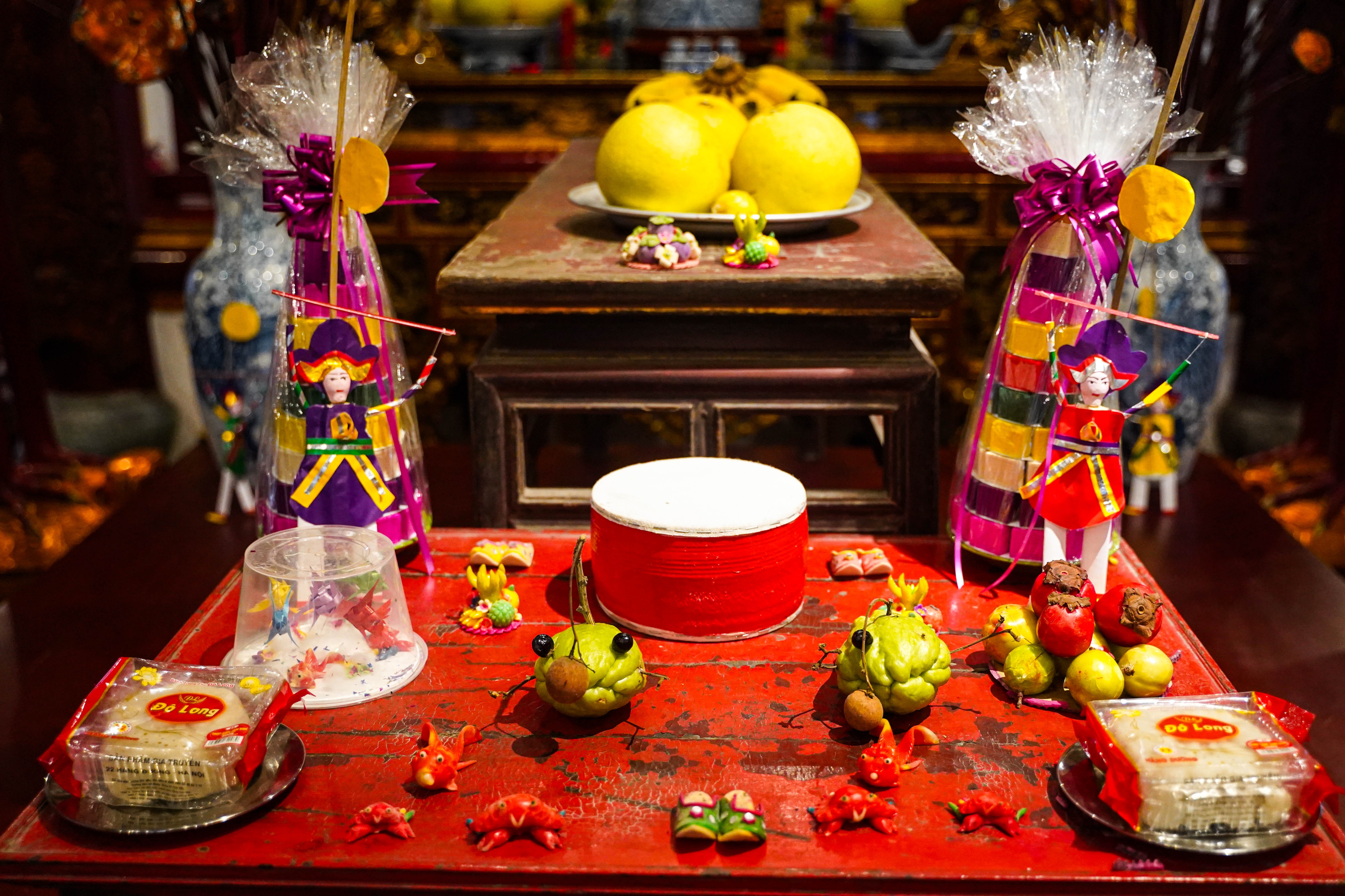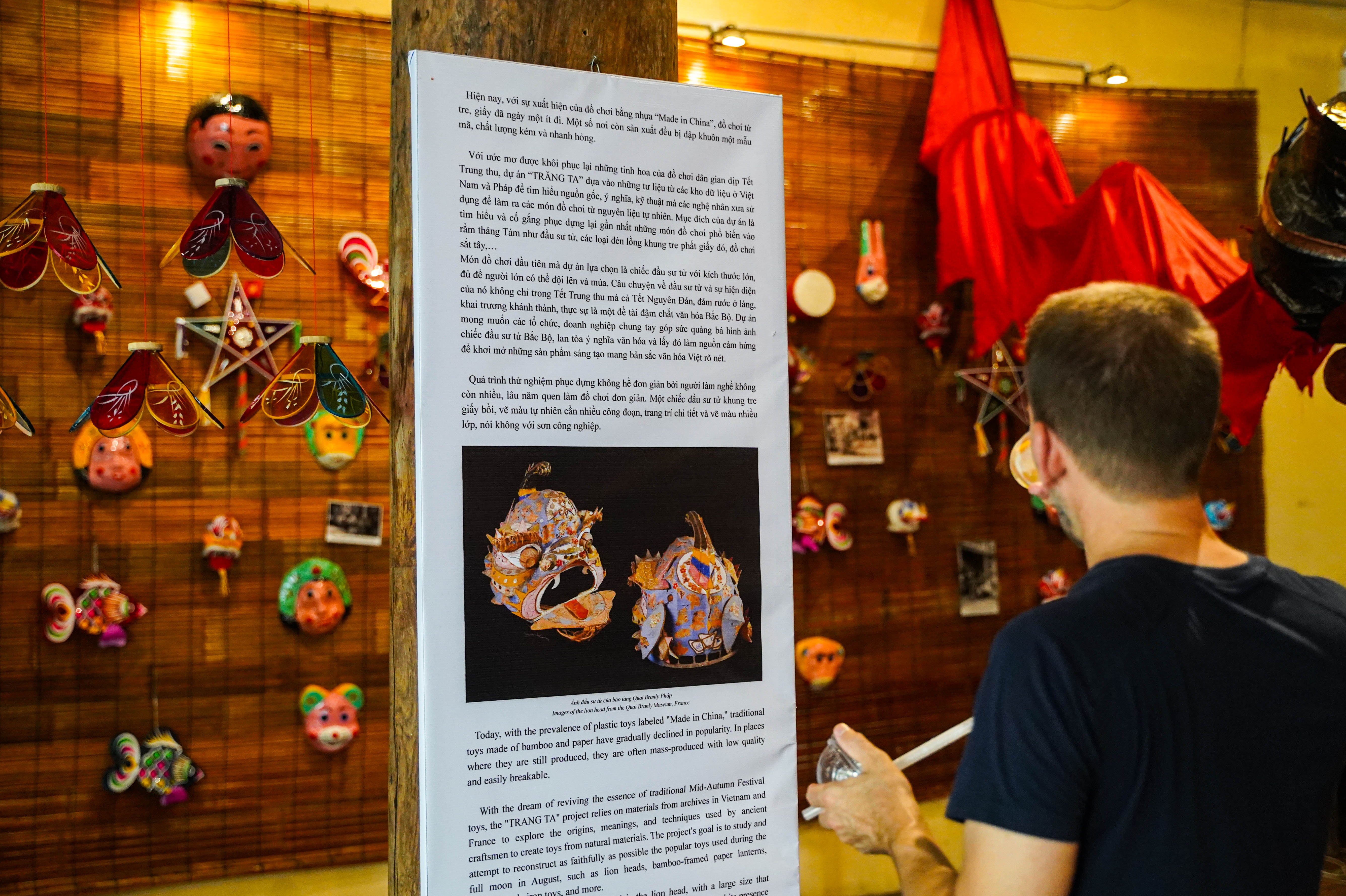 Bên cạnh đầu sư tử, triển lãm tái hiện mâm cỗ Trung thu truyền thống. Từng món quà quen thuộc như cốm chuối, bánh nướng, bánh dẻo, con giống bột chợ Đồng Xuân, ông tiến sĩ giấy, cá hóa long, thiềm thừ tỉa từ hoa quả, được bày biện trang trọng.