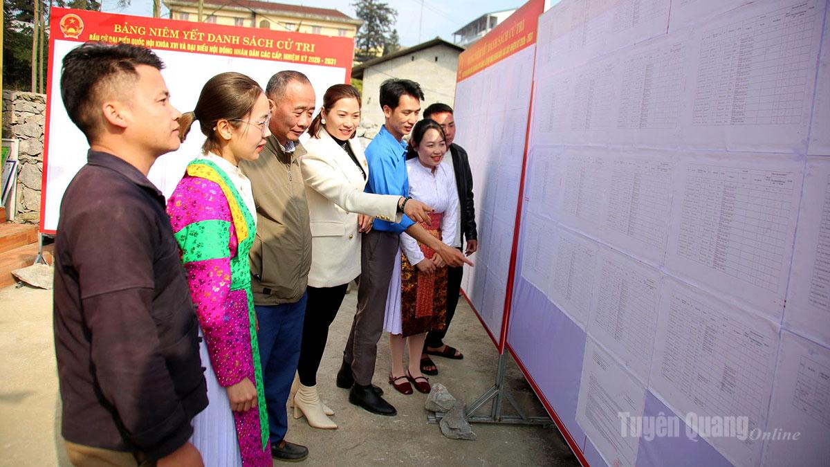 Người dân xã Khâu Vai chủ động rà soát danh sách cử tri tại điểm bỏ phiếu.
