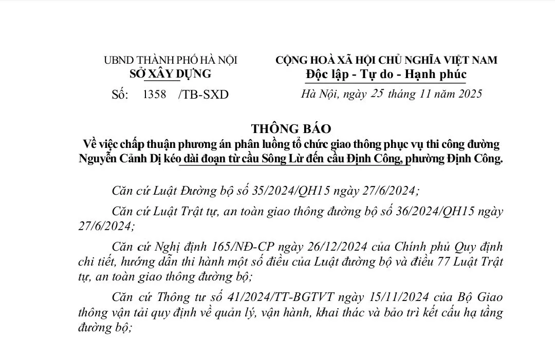 Thông báo số 1358/TB-SXD của Sở Xây dựng Hà Nội đã cụ thể hóa phương án phân luồng giao thông phục vụ thi công đường Nguyễn Cảnh Dị kéo dài. Đây là bước đi quan trọng trong tiến trình hoàn thiện hạ tầng khu vực phía Nam khu vực nội thành Hà Nội, đặc biệt khi đường Vành đai 2,5 chuẩn bị thông tuyến vào Tết Nguyên đán 2026.