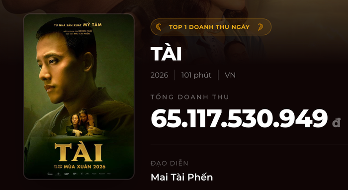 Hiện phim Tài đang đạt top 1 doanh thu phòng vé ngày, và tổng doanh thu là hơn 65 tỷ. - Nguồn: Box Office