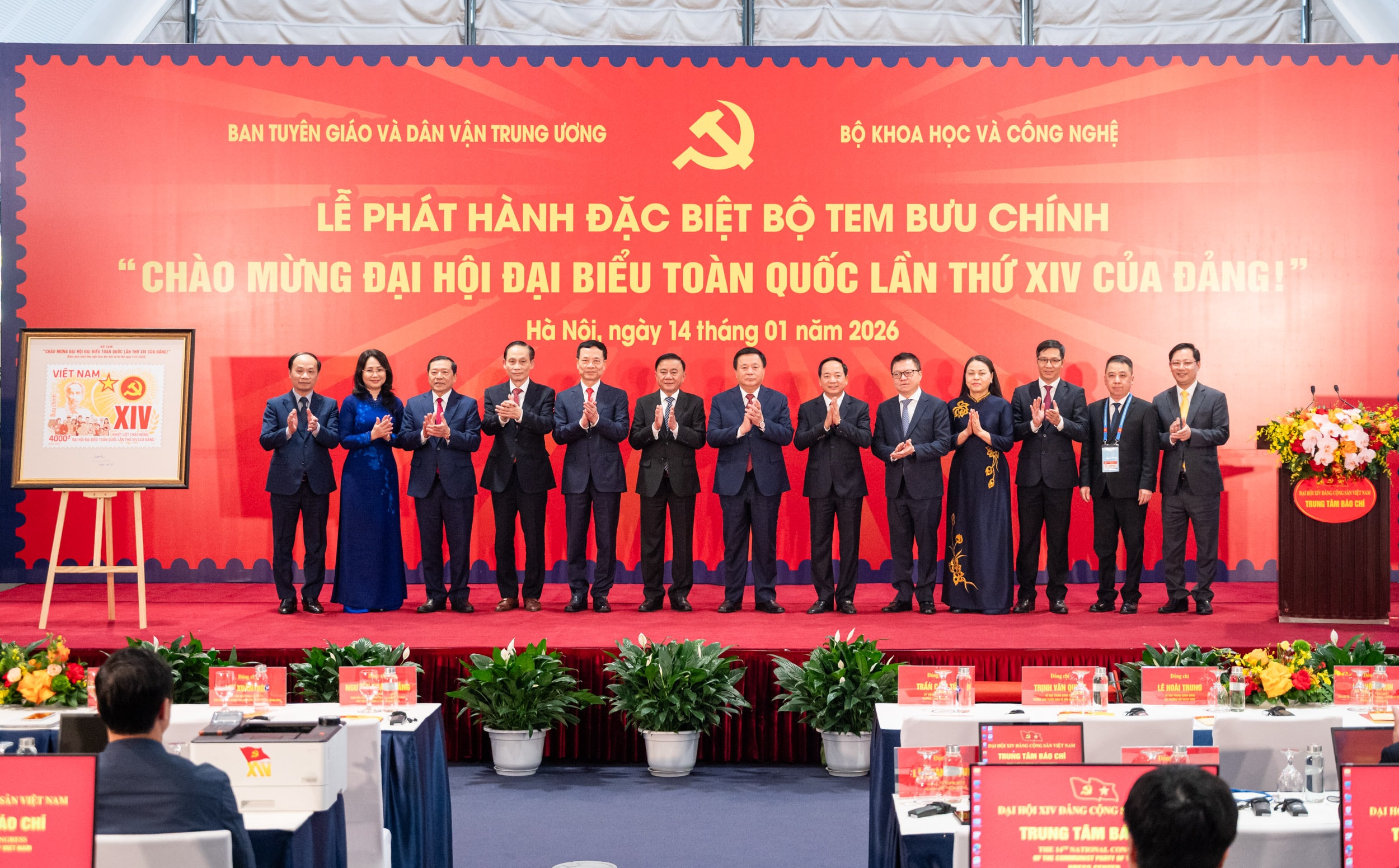 Thường trực Ban Bí thư Trần Cẩm Tú và đại diện lãnh đạo các ban, bộ, ngành, cơ quan tham dự Lễ phát hành đặc biệt Bộ tem bưu chính chào mừng Đại hội đại biểu toàn quốc lần thứ XIV của Đảng. Ảnh: Phạm Thắng