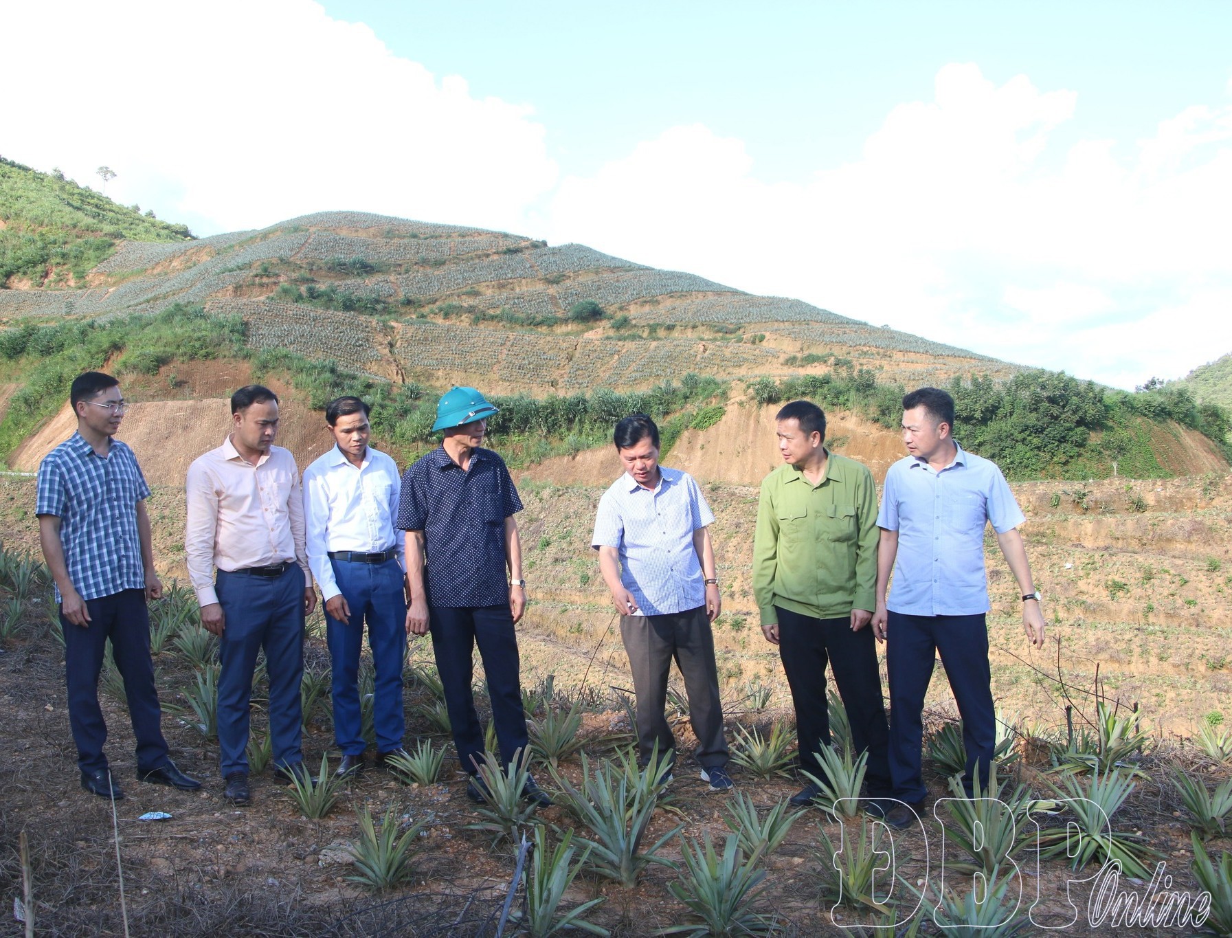 Lãnh đạo xã Búng Lao kiểm tra mô hình dứa mật tại bản Hồng Sọt.