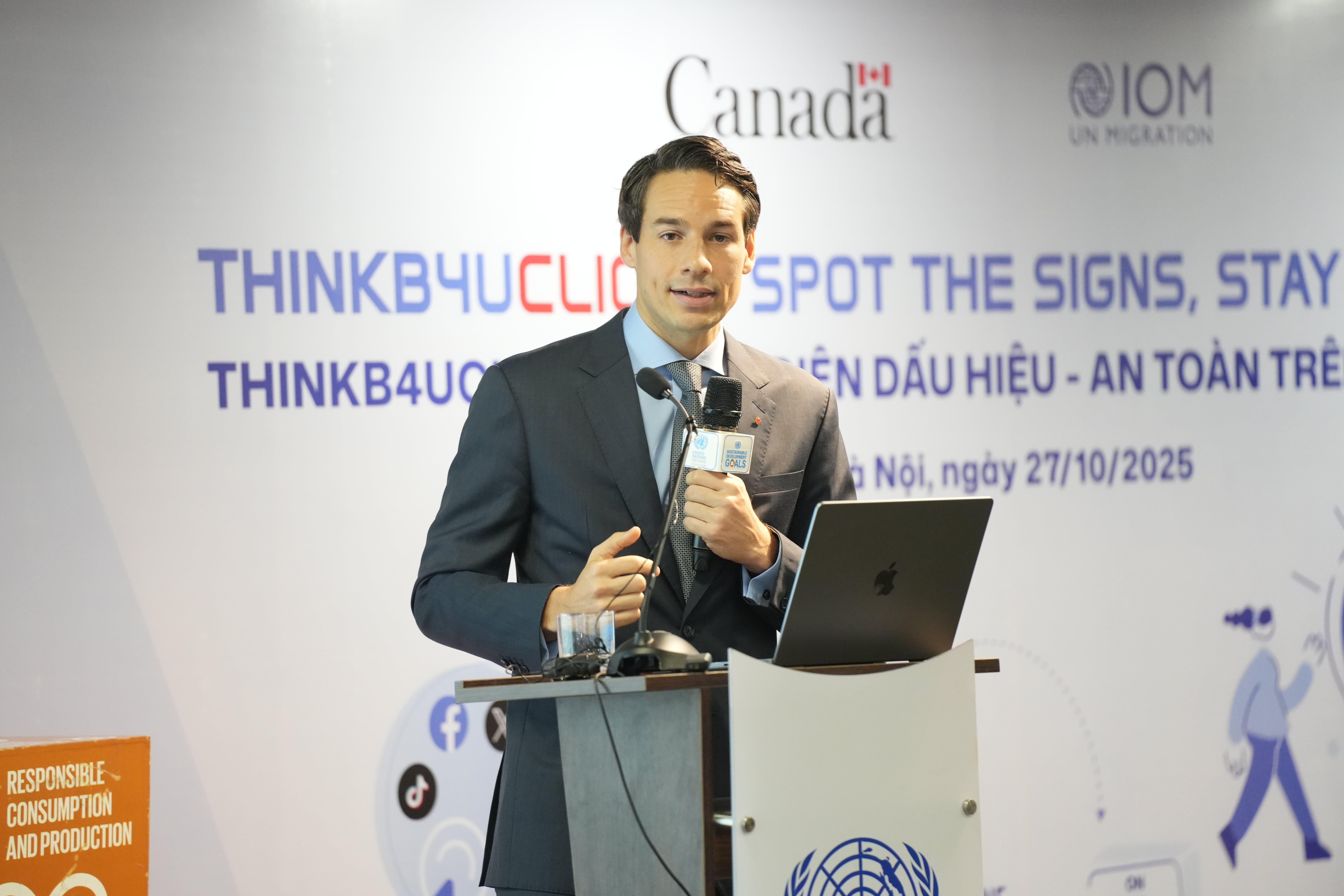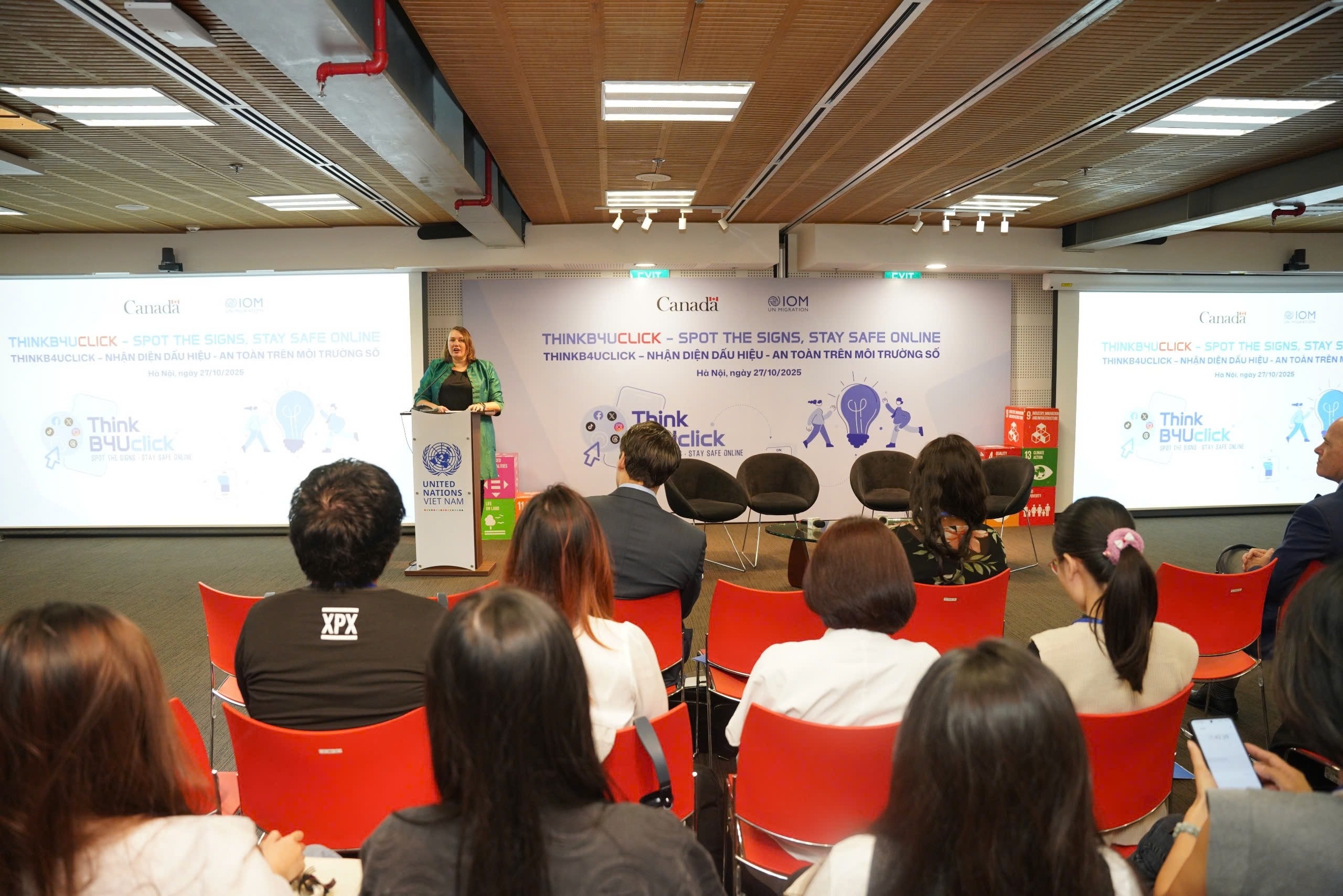 Ngày 27/10, Tổ chức Di cư Quốc tế (IOM) phối hợp cùng Đại sứ quán Canada tại Việt Nam chính thức khởi động chương trình “ThinkB4UClick” - một sáng kiến nhằm nâng cao nhận thức, trang bị kỹ năng phòng vệ số và thúc đẩy tư duy phản biện cho thanh niên trong phòng, chống mua bán người trên không gian mạng.
