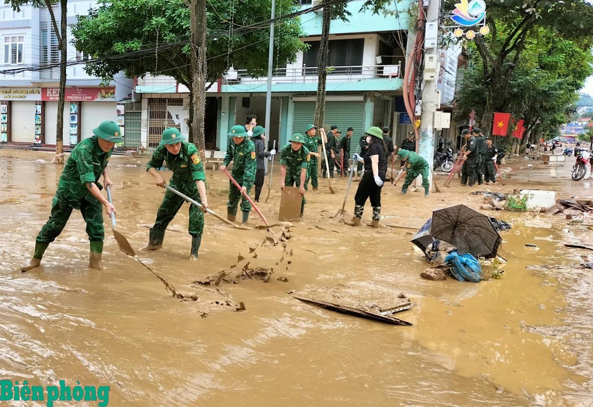 Cán bộ, chiến sĩ Bộ đội Biên phòng tỉnh Cao Bằng phối hợp với các lực lượng thu dọn vệ sinh đường phố sau mưa lũ. Ảnh: Huy Dương