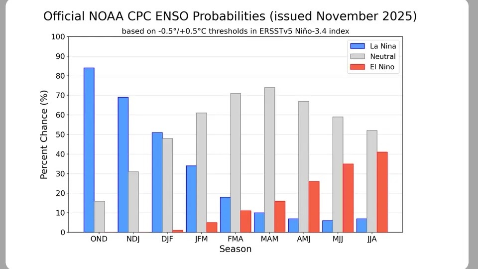 Trung tâm Dự báo Khí hậu Mỹ (CPC) tiếp tục duy trì “khuyến cáo La Ninã”, xác nhận nhiệt độ mặt nước biển ở xích đạo Thái Bình Dương vẫn thấp. Tuy nhiên, tình trạng này được dự báo sẽ không kéo dài lâu: La Ninã nhiều khả năng nhạt dần và chấm dứt vào khoảng tháng 2 tới.