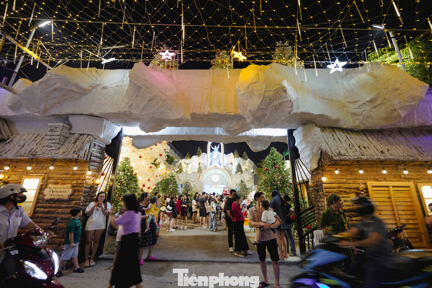 Từ sau 17h, các lối dẫn vào giáo xứ Hợp An đông nghịt du khác và giáo dân. Có thể thấy, từ bên ngoài giáo xứ, du khách dã cảm nhận rất rõ không khí Giáng sinh khi đi ngang dãy nhà gỗ được thiết kế như một ngôi làng cổ.