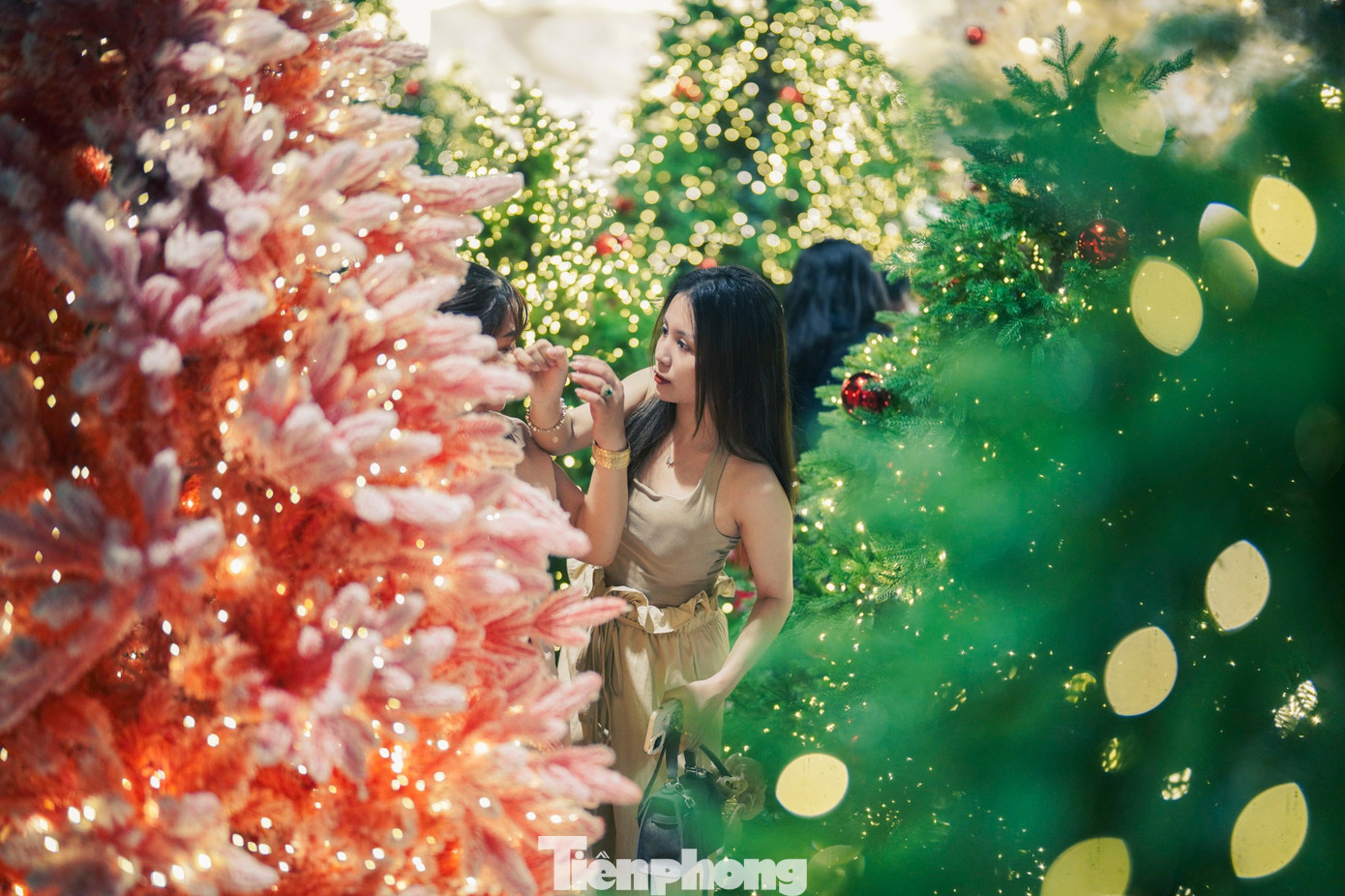 Xen kẽ giữa sắc xanh truyền thống là những cây thông màu hồng, chi tiết phá cách hiếm thấy trong trang trí Giáng sinh tại các giáo xứ ở TP HCM.