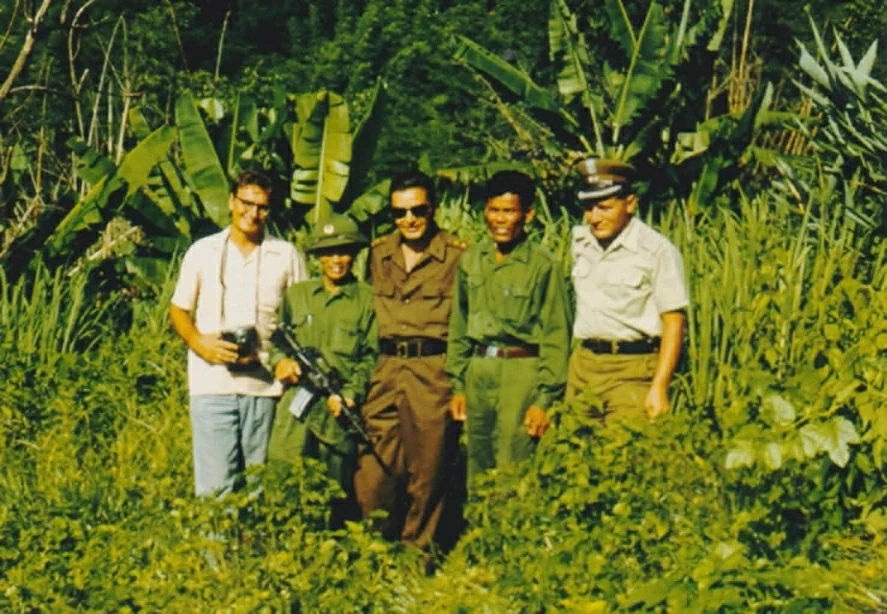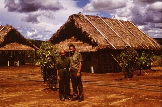 Tác giả chụp ảnh với bác sĩ của lực lượng Mặt trận Dân tộc Giải phóng miền Nam tại khu trại của ICCS ở Bến Hét, Kon Tum vào năm 1973. (Ảnh TGCC)