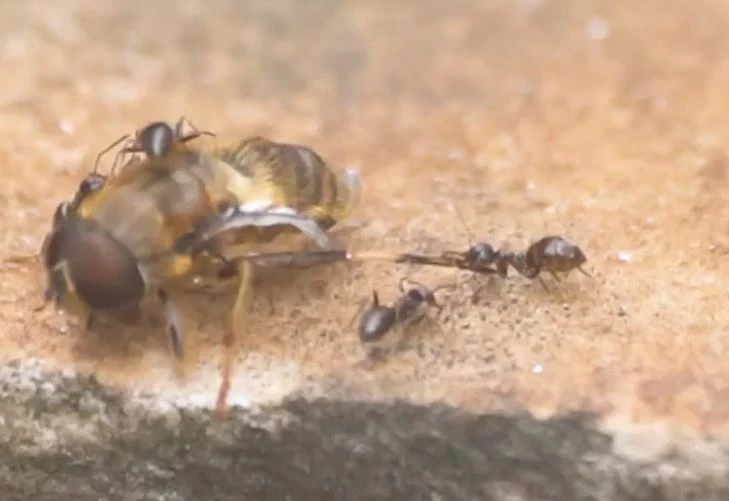 Chưa dừng lại ở đó, sau khi quật ngã con mồi, đàn kiến quân đội tiếp tục kéo xác ong xuống tổ, biến kẻ xâm nhập thành nguồn thức ăn cho cả đàn.