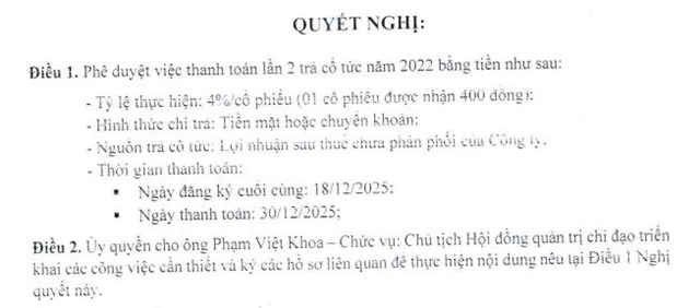 Công ty cổ phần Fecon (mã ck: FCN) vừa công bố Nghị quyết của Hội đồng quản trị về việc phê duyệt thanh toán lần 2 trả cổ tức năm 2022 cho cổ đông bằng tiền.