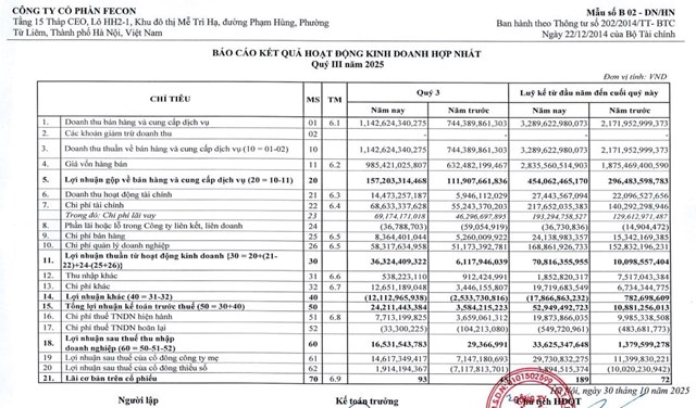 Về bức tranh tài chính, theo báo cáo kinh doanh hợp nhất quý III/2025, tính chung 9 tháng đầu năm 2025, Fecon mang về doanh thu thuần hơn 3.289 tỷ đồng, tăng 51,5% so với 9 tháng đầu năm 2024. Lợi nhuận sau thuế thu nhập đạt hơn 33,6 tỷ đồng, gấp 24 lần cùng kỳ.