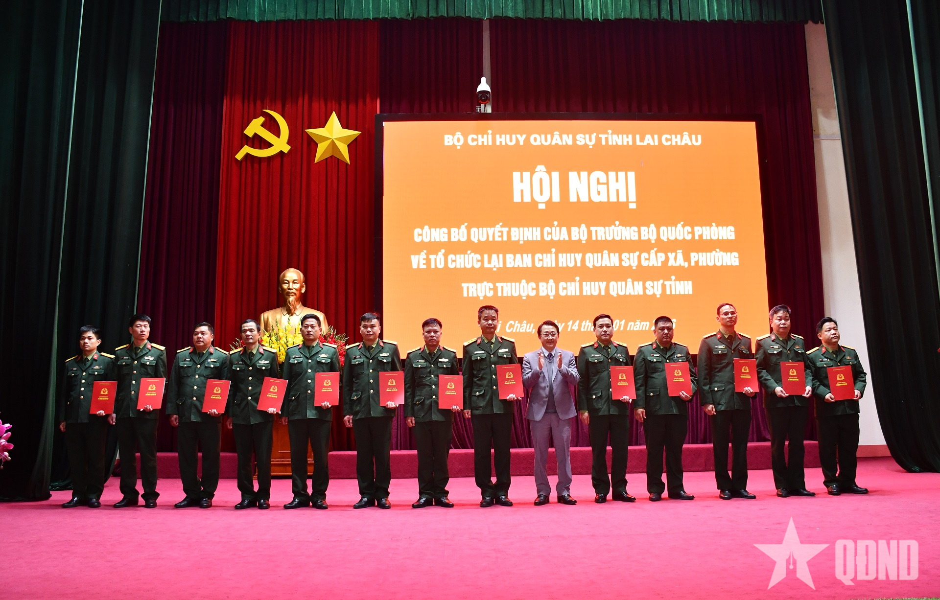 Tại hội nghị, Bộ CHQS tỉnh đã công bố quyết định của Bộ trưởng Bộ Quốc phòng về việc tổ chức lại Ban CHQS xã, phường; Quyết định của Tổng Tham mưu trưởng về việc ban hành biểu tổ chức, biên chế của Ban CHQS xã, phường, đặc khu; công bố và trao Quyết định của Bộ tư lệnh Quân khu 2 về việc bổ nhiệm có thời hạn đối với 38 cán bộ giữ chức Chỉ huy trưởng Ban CHQS các xã, phường trên địa bàn tỉnh Lai Châu.