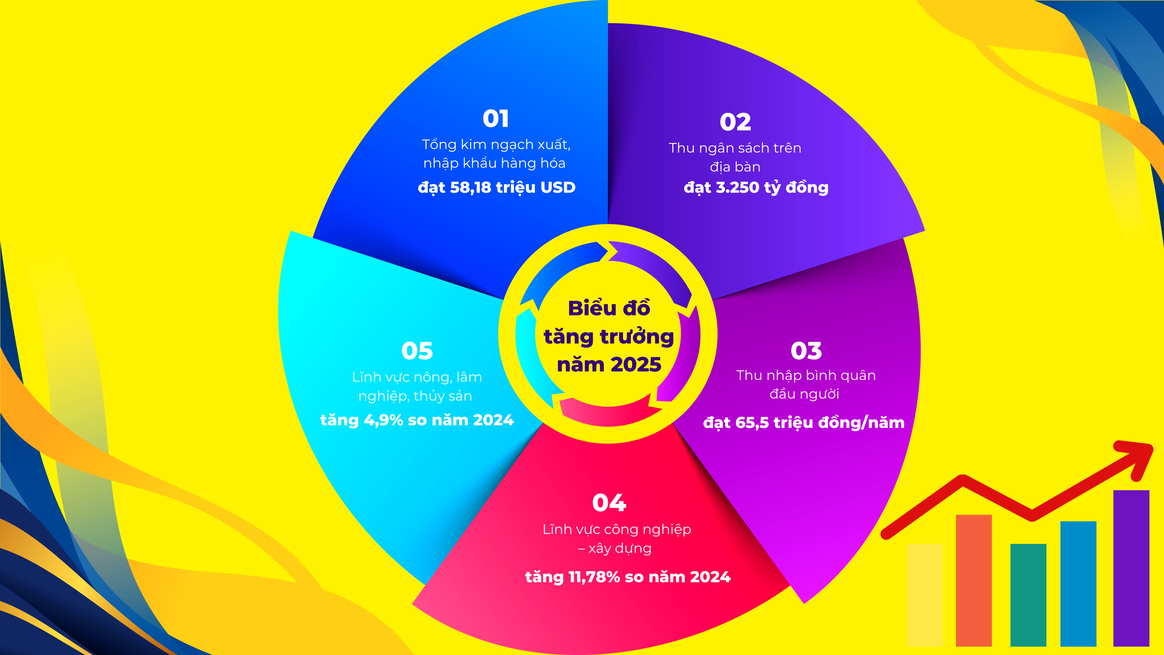 Cơ cấu tăng trưởng tiếp tục có sự chuyển dịch theo hướng tích cực. Khu vực công nghiệp – xây dựng tăng 11,78%; dịch vụ tăng 7,2%; lĩnh vực nông, lâm nghiệp, thủy sản tăng 4,9%; thu nhập bình quân đầu người đạt 65,5 triệu đồng/năm, tăng gần 3 triệu đồng so với năm 2024; tổng kim ngạch xuất, nhập khẩu hàng hóa đạt 58,18 triệu USD, tăng 98,2% so với năm 2024; tổng lượt khách du lịch tăng 8,5% so với năm 2024; thu ngân sách trên địa bàn đạt 3.250 tỷ đồng, tăng 28% so với năm 2024.