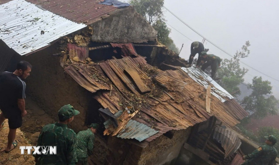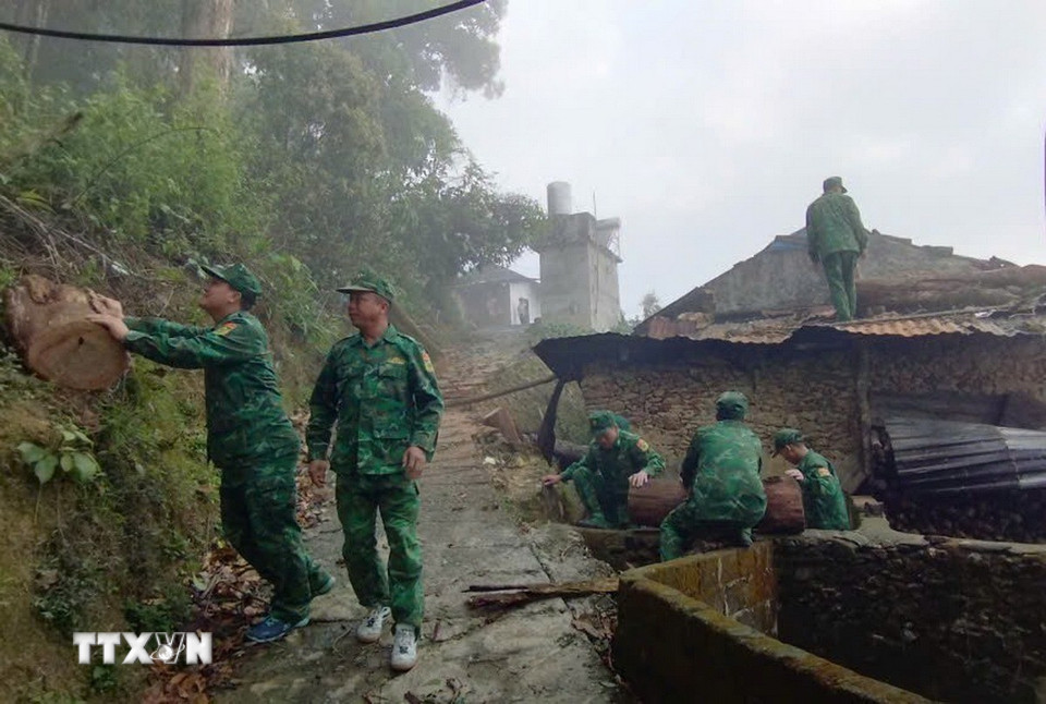 Lực lượng Biên phòng hỗ trợ người dân xã Thu Lũm dọn dẹp, gia cố nhà cửa bị ảnh hưởng bởi gió lốc. (Ảnh: TTXVN phát)