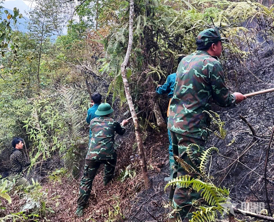 Lực lượng tham gia chữa cháy rừng tại xã Tủa Xín Chải, tỉnh Lai Châu.