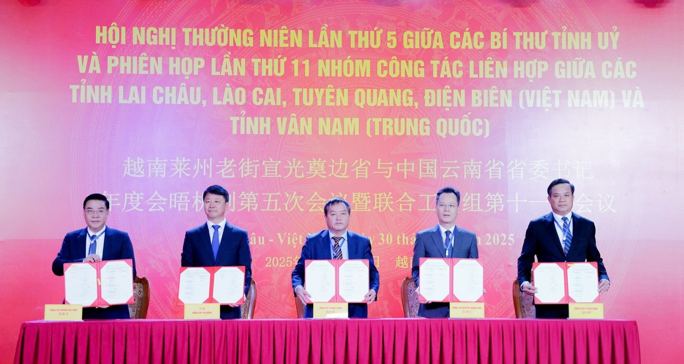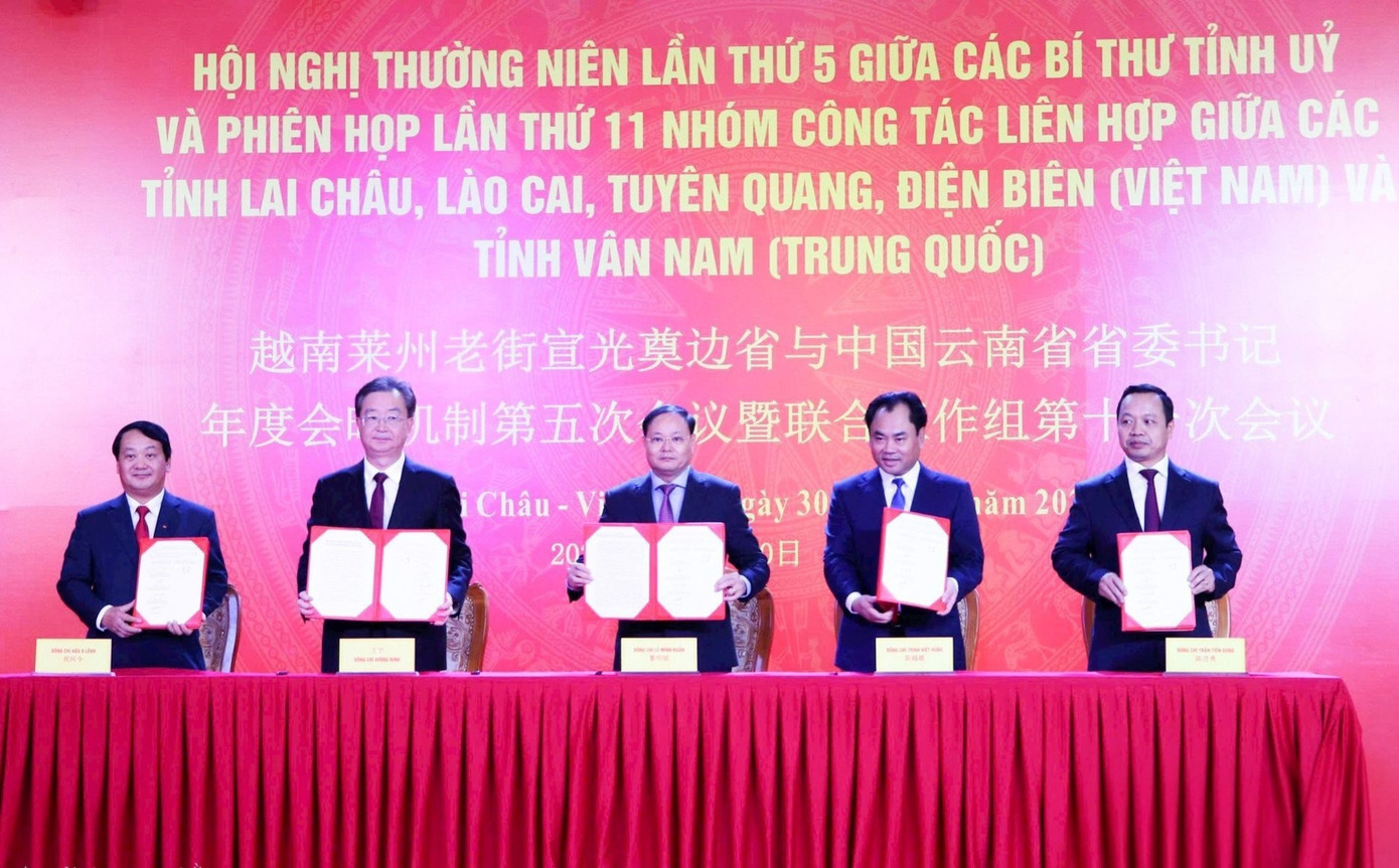 Bí thư Tỉnh ủy 5 tỉnh ký Biên bản Hội nghị thường niên lần thứ 5 giữa Bí thư Tỉnh ủy các tỉnh: Lai Châu, Lào Cai, Hà Giang, Điện Biên (Việt Nam) và Bí thư Tỉnh ủy Vân Nam (Trung Quốc). Ảnh: Tuấn Hùng.