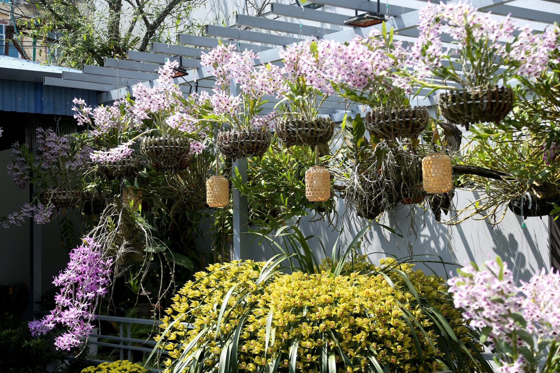 Từng chùm hoa tử đằng rủ xuống mềm mại, mang vẻ đẹp lãng mạn, thanh tao.