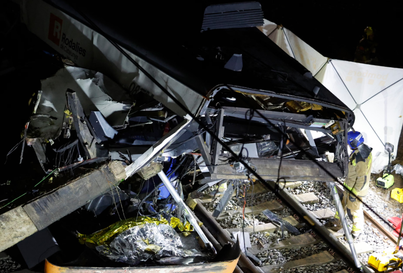 Hiện trường vụ tai nạn tàu hỏa gần Barcelona (Tây Ban Nha). (Ảnh: Alberto Estévez/EPA).