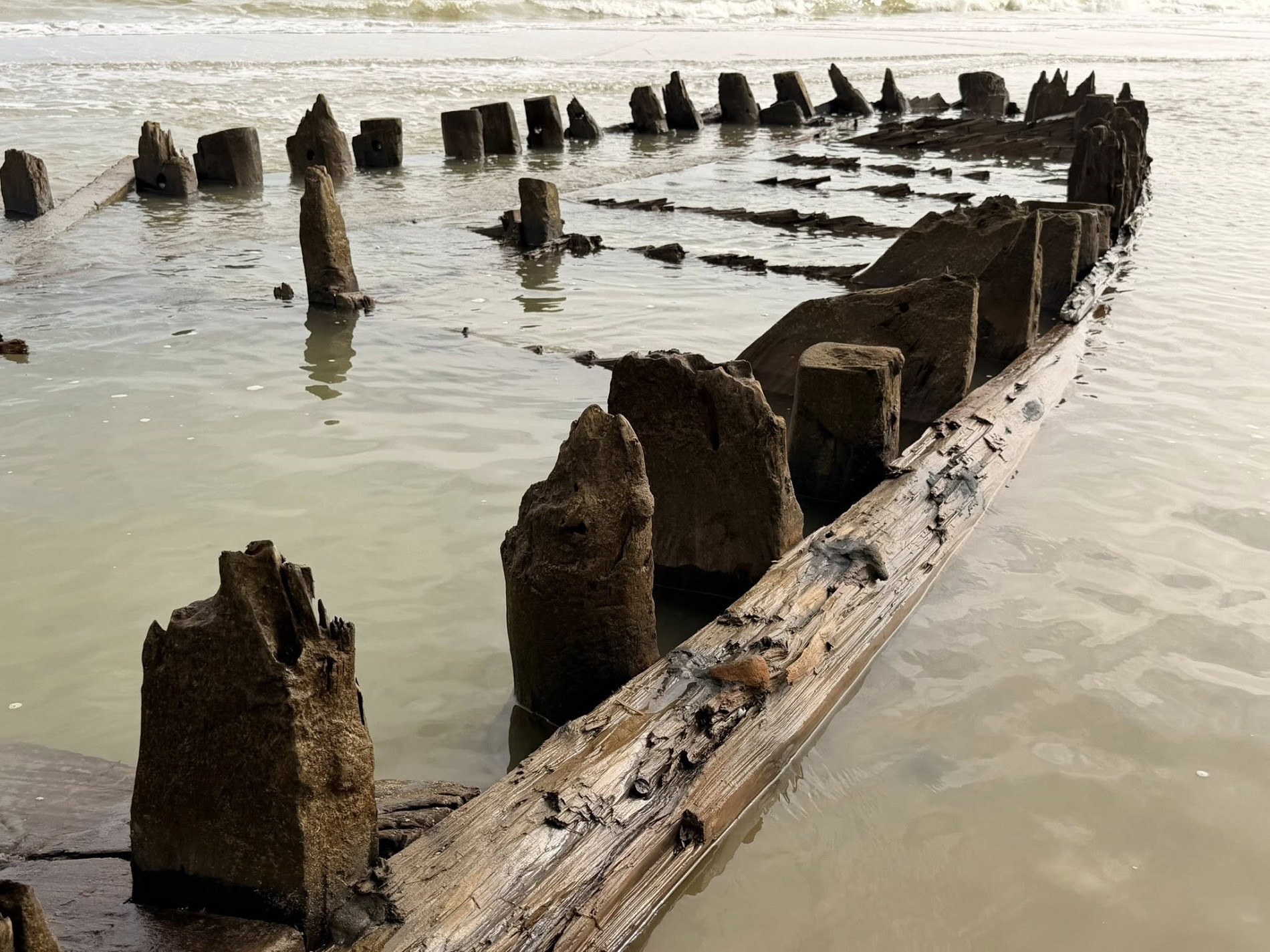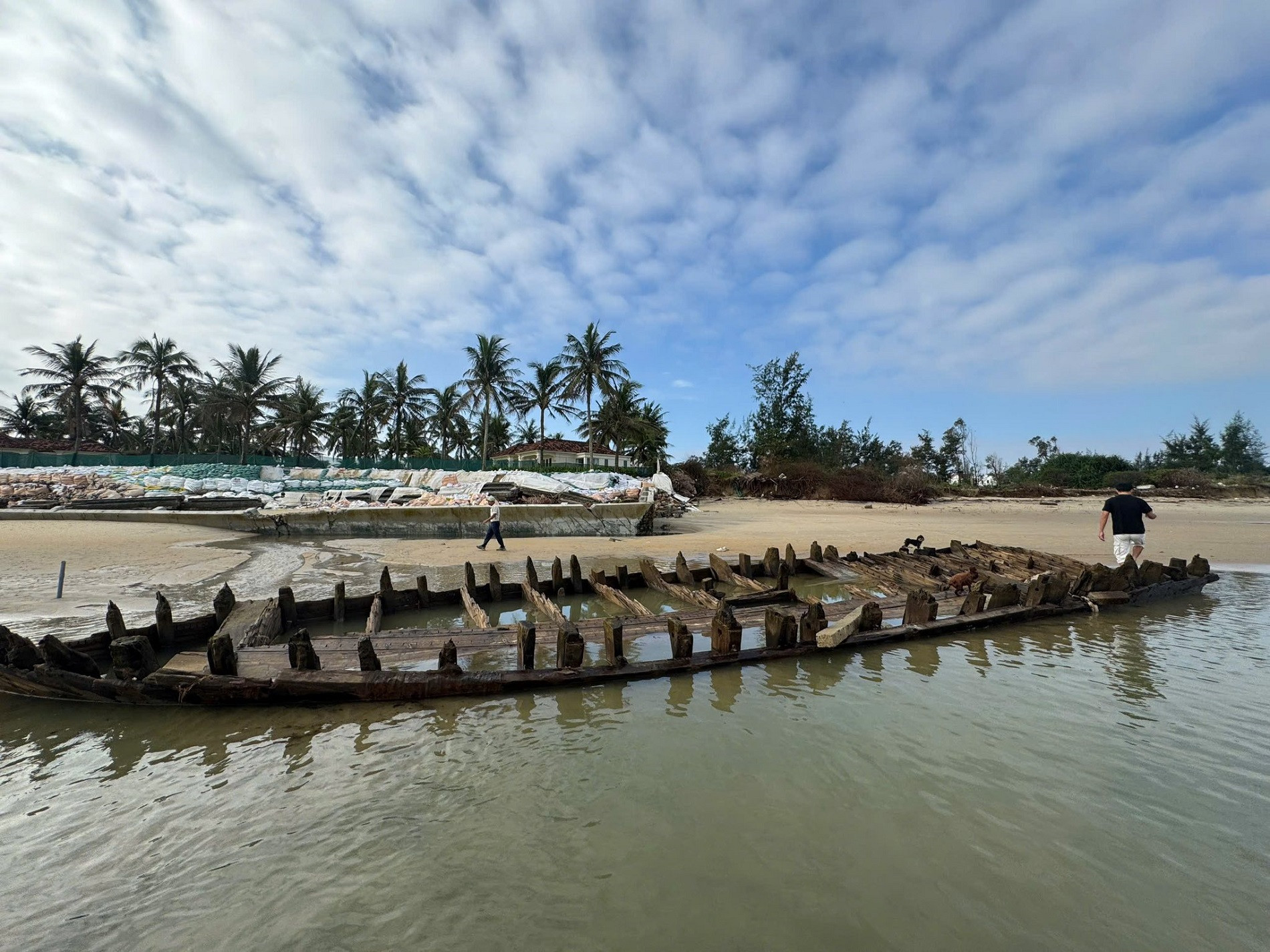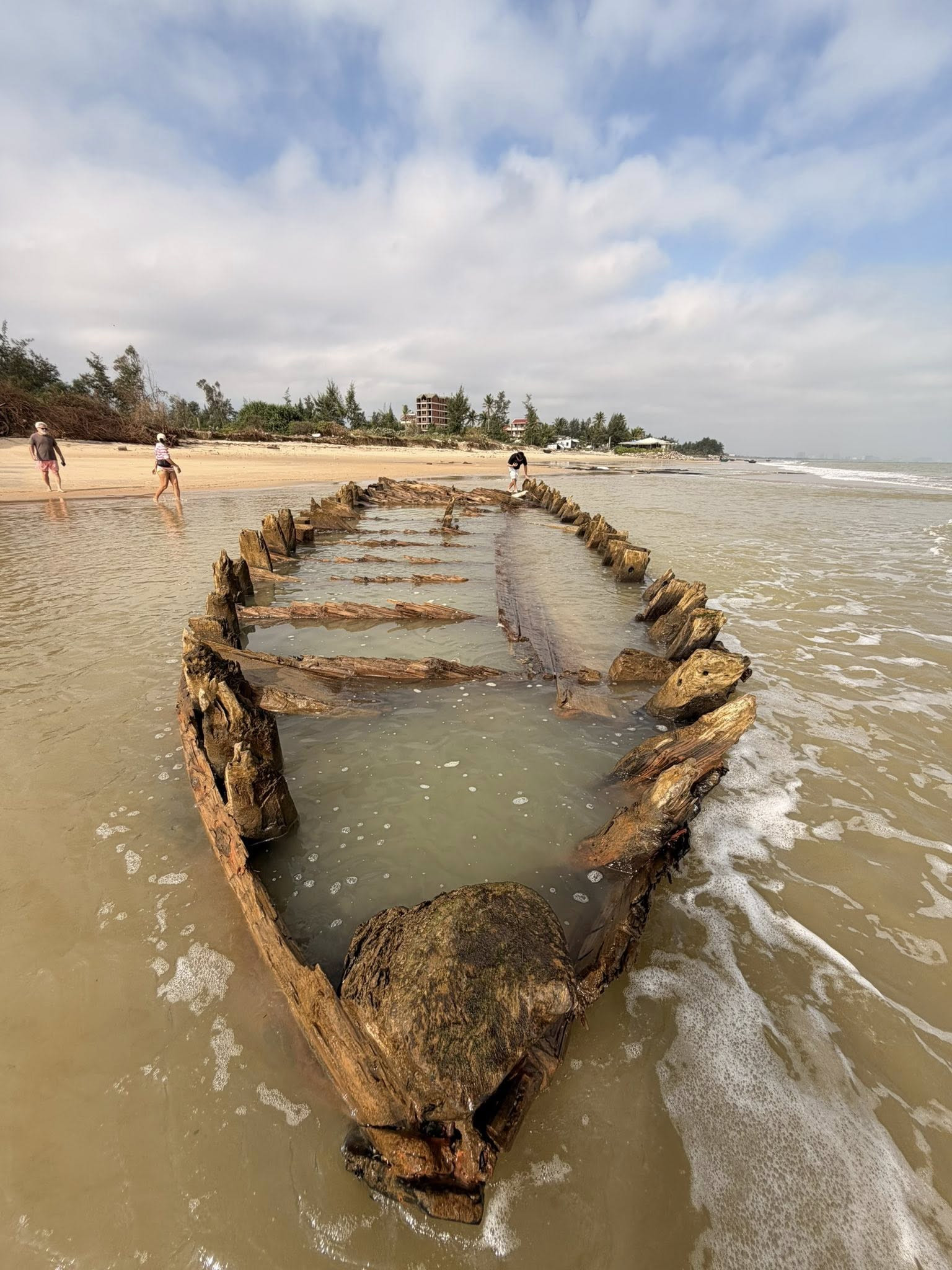 Những ngày qua, sóng mạnh liên tiếp xâm thực bờ biển, cuốn trôi lớp cát phủ, kết hợp mực nước rút thấp vào buổi sáng, phần thân tàu gỗ dài hàng chục mét lộ rõ hơn. Con tàu nằm song song với bờ, nhiều bộ phận vẫn còn nguyên kết cấu, thu hút sự chú ý của người dân và du khách.