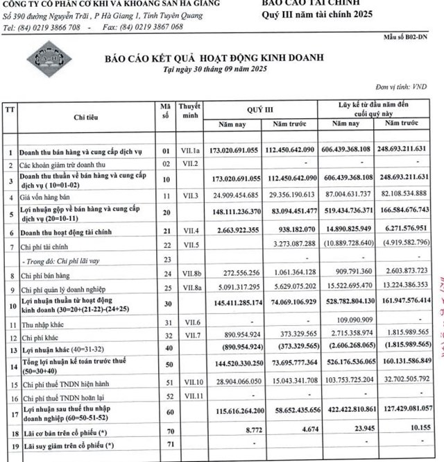 Về bức tranh tài chính, trong quý III/2025, HGM ghi nhanạ doanh thu thuần đạt 173 tỷ đồng, tăng 53,9% so với cùng kỳ năm ngoái.