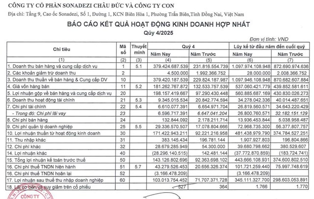 Sonadezi Châu Đức giải thích, trong kỳ, căn cứ kết quả kiểm tra thuế của cơ quan thuế đối với năm 2024, đồng thời trên cơ sở thực hiện rà soát lại nghĩa vụ thuế thu nhập doanh nghiệp của các năm trước, Công ty đã thực điều chỉnh hồi tố chi phí thuế thu nhập doanh nghiệp, dẫn đến việc điều chỉnh hồi tố lợi nhuận sau thuế thu nhập doanh nghiệp của các năm trước theo quy định của chuẩn mực kế toán hiện hành.