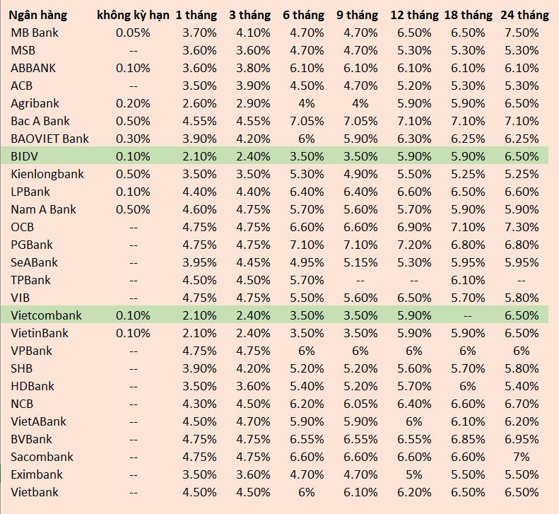 Ở kỳ hạn 24 tháng, mức cao nhất thuộc về MB Bank với 7,50%/năm, trong khi Bac A Bank duy trì 7,10%/năm và một số ngân hàng như OCB, BVBank, Sacombank dao động quanh 6,95-7,30%/năm.