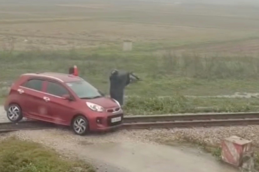 Tài xế ôtô ra tín hiệu cầu cứu khi phương tiện mắc kẹt trên đường ray, chiều 5/12. Ảnh: Cắt từ video.