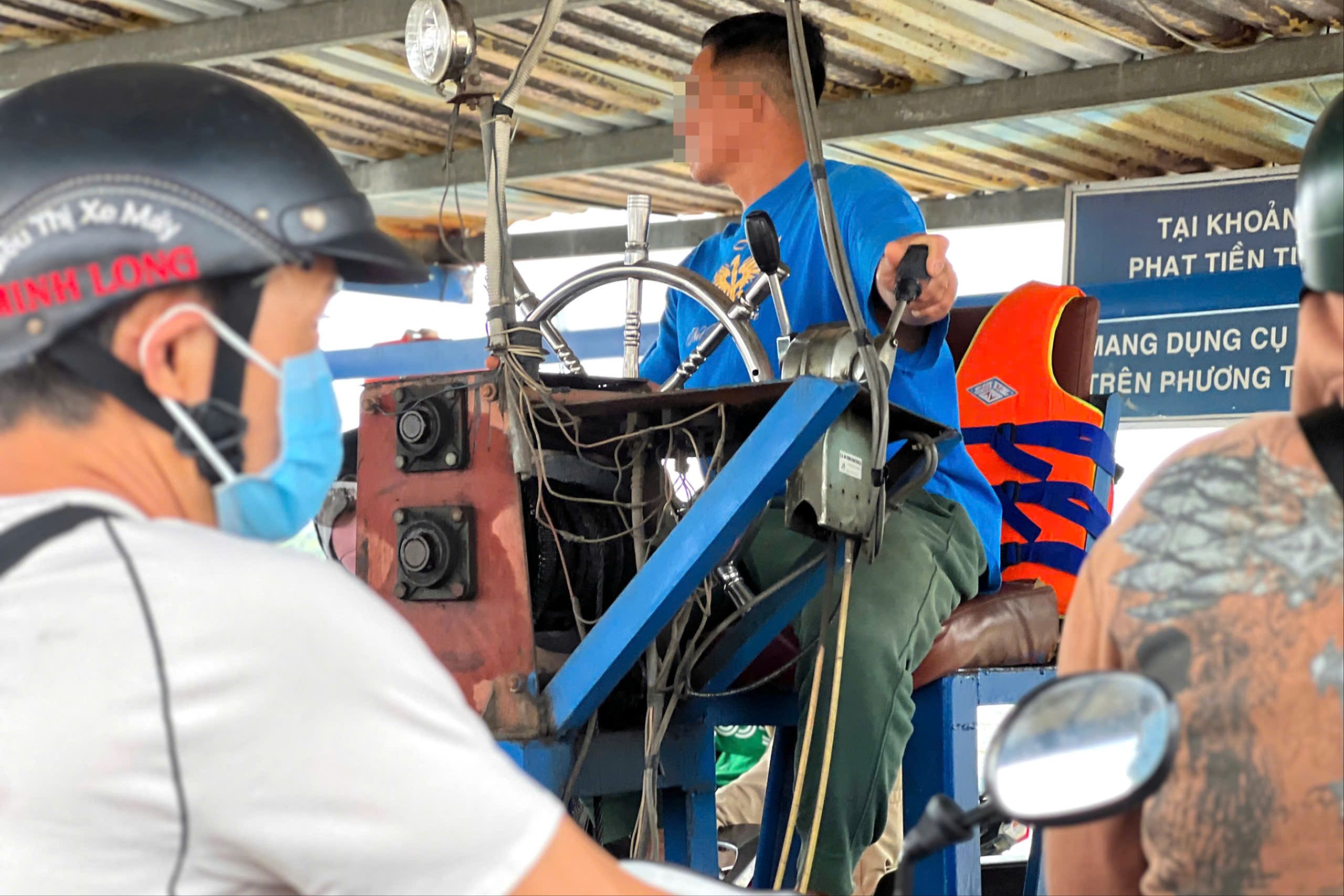 Thuyền viên điều khiển phương tiện tại bến phà Bình Quới không mặc áo phao cứu sinh trong suốt quá trình vận hành, vi phạm quy định an toàn giao thông đường thủy, tiềm ẩn nguy cơ mất an toàn khi xảy ra sự cố bất ngờ. Ảnh: PHẠM HẢI