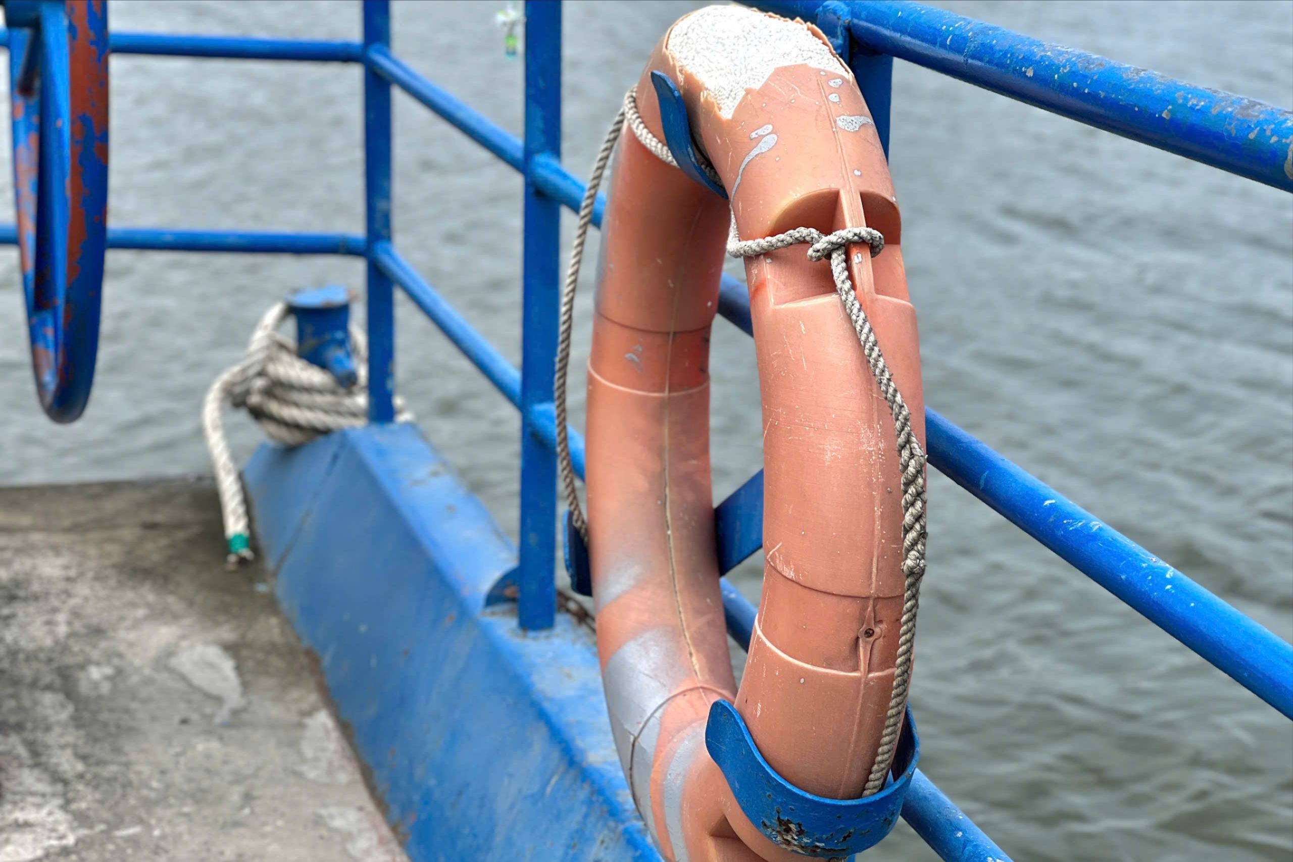 Nhiều áo phao cứu sinh trên phà Bình Quới bị hư hỏng, lộ lõi xốp, nứt vỡ, không còn đảm bảo chất lượng sử dụng, gây lo ngại về mức độ an toàn khi xảy ra tình huống khẩn cấp trên sông. Ảnh: PHẠM HẢI