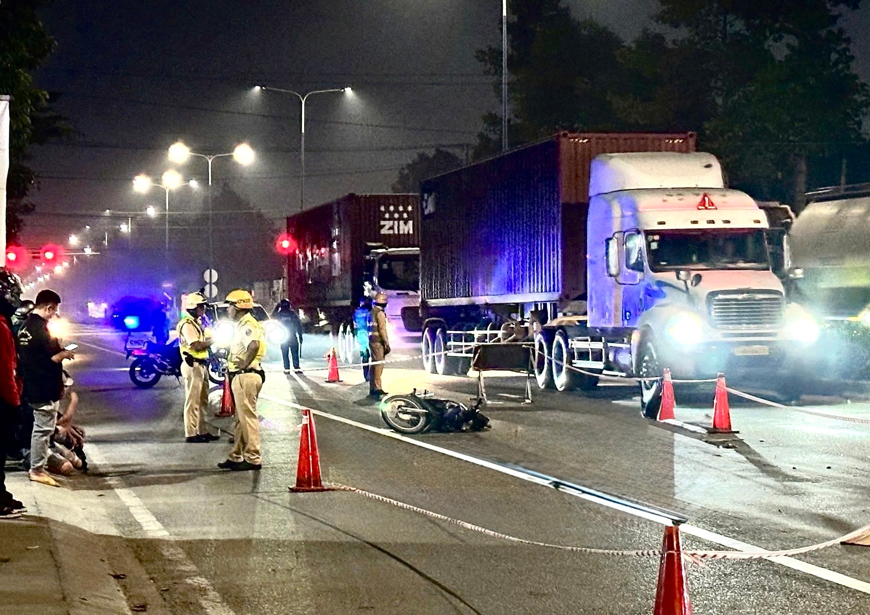 Đến 22h30 ngày 13/12, Công an TP.HCM vẫn đang khám nghiệm hiện trường, điều tra nguyên nhân vụ tai nạn giao thông giữa ô tô đầu kéo và xe máy khiến một người tử vong tại chỗ.