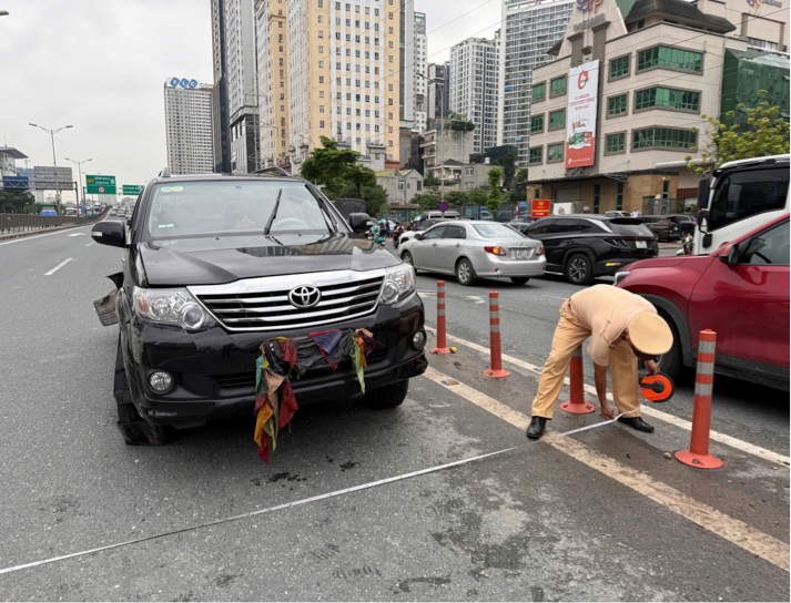 Khoảng 15h10 ngày 14/10, Đội CSGT đường bộ số 6 nhận được tin báo của người dân về việc có một xe ô tô đi từ đường Võ Văn Kiệt qua cầu Thăng Long, lên đường Vành đai 3 trên cao, bị xịt hai lốp bên phụ và người điều khiển có biểu hiện không bình thường.