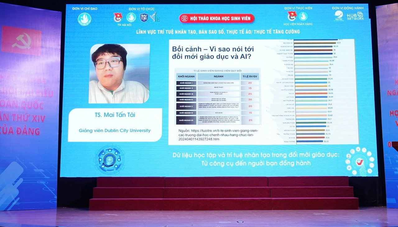 TS. Mai Tấn Tài - Giảng viên Đại học Dublin City (Ireland) với chủ đề “Dữ liệu học tập và trí tuệ nhân tạo trong đổi mới giáo dục: Từ công cụ đến người bạn đồng hành”; TS. Phan Thanh Đức - Trưởng khoa Công nghệ thông tin và Kinh tế số, Học viện Ngân hàng với chủ đề “Phát triển nguồn nhân lực trong thời đại AI: Từ giảng đường đến thực tiễn”…