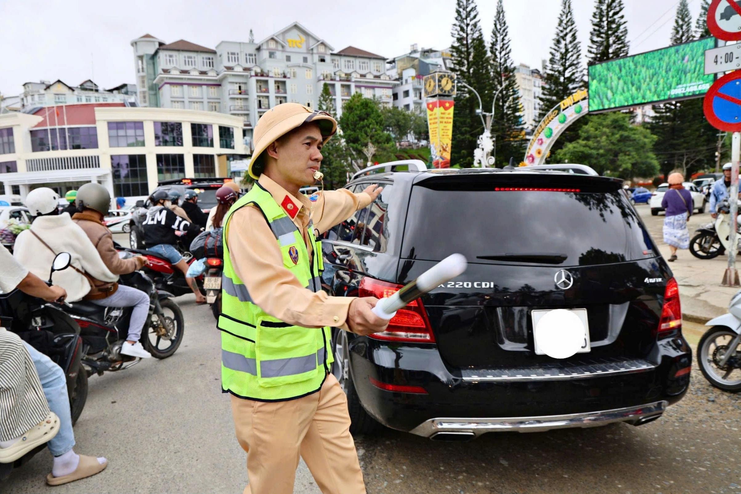 Lực lượng Cảnh sát giao thông làm nhiệm vụ điều tiết giao thông tại Đà Lạt