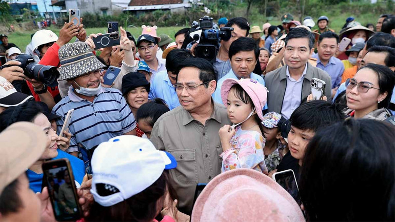 Thủ tướng Phạm Minh Chính thăm, động viên nhân dân thôn Phú Thứ, xã Tây Hòa, tỉnh Đắk Lắk, chiều 29/11. (Ảnh: VGP/Nhật Bắc)