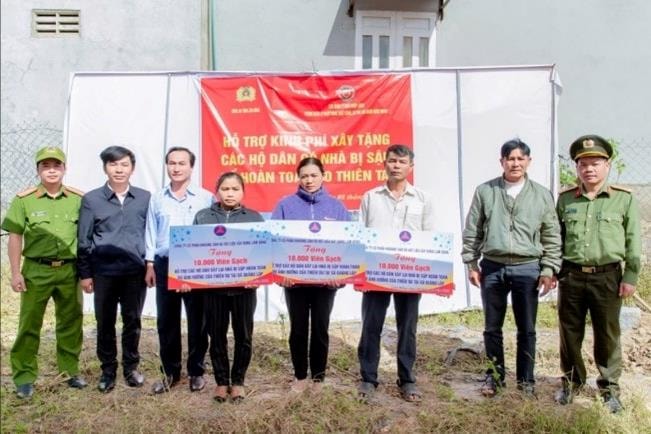 Công an xã Quảng Lập phối hợp Công an tỉnh Lâm Đồng và các doanh nghiệp trao kinh phí, vật liệu xây dựng hỗ trợ các hộ dân bị thiệt hại nhà ở do mưa lũ.