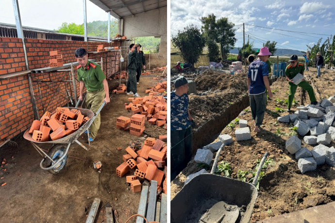 Không dừng lại ở hỗ trợ vật chất, lực lượng Công an xã còn trực tiếp tham gia ngày công lao động: đào móng, trộn bê tông, vận chuyển vật liệu, dựng nền móng nhà. Hằng ngày, nhiều cán bộ, chiến sĩ cùng lực lượng ANTT cơ sở phối hợp lực lượng Cảnh sát cơ động Công an tỉnh Lâm Đồng và các nhà thầu đẩy nhanh tiến độ xây dựng nhà ở cho người dân. Hình ảnh cán bộ, chiến sĩ miệt mài giữa nắng gắt đã để lại ấn tượng sâu sắc về tinh thần tận tụy, trách nhiệm, luôn đồng hành cùng Nhân dân.