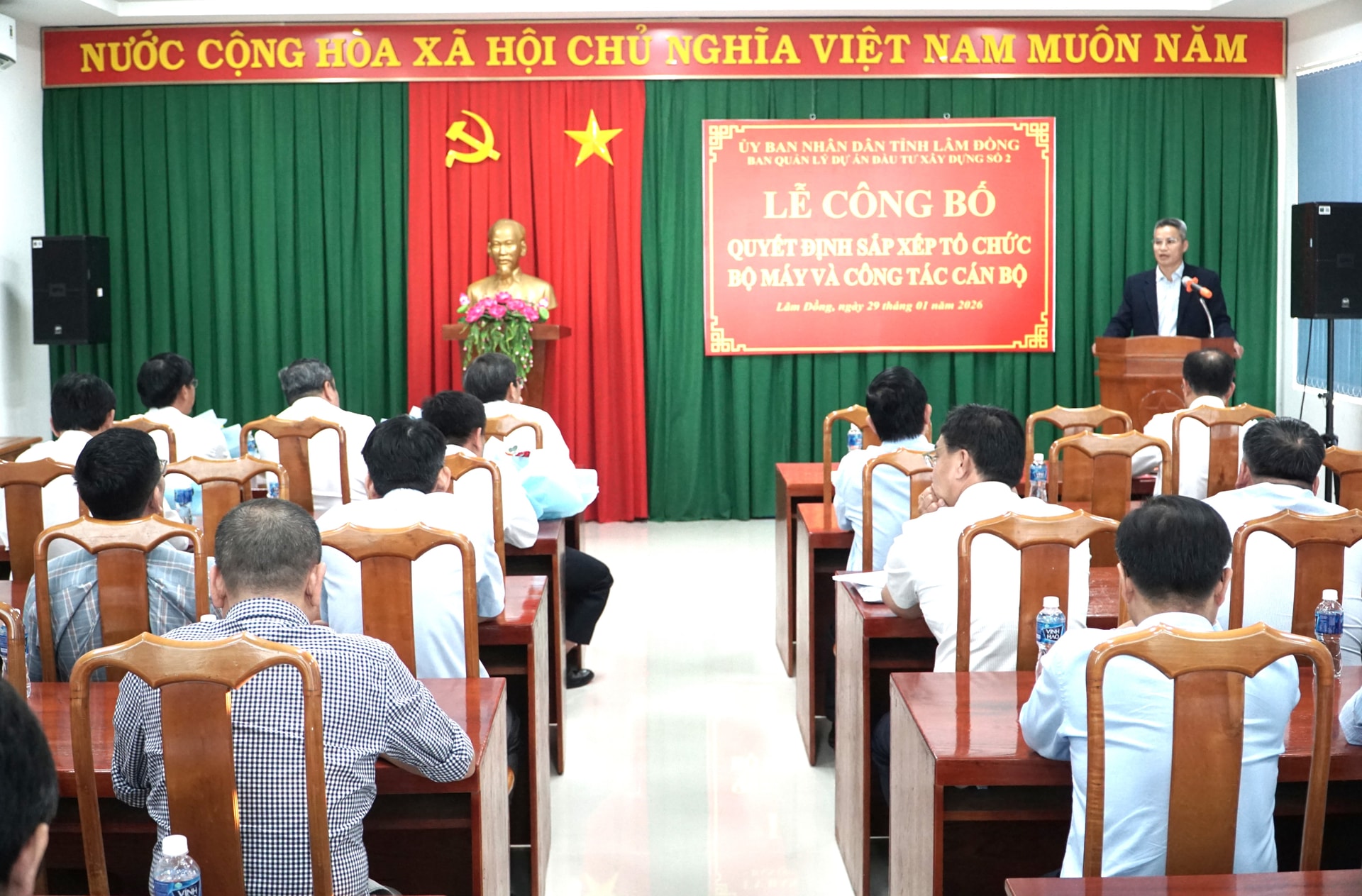 Cùng với việc sắp xếp tổ chức, buổi Lễ cũng công bố các quyết định của Chủ tịch UBND tỉnh bổ nhiệm viên chức quản lý của Ban Quản lý dự án đầu tư xây dựng số 2. Theo đó, ông Phan Thanh Hoàng, Giám đốc Ban Quản lý dự án Nông nghiệp tỉnh Lâm Đồng, được bổ nhiệm giữ chức Giám đốc Ban Quản lý dự án đầu tư xây dựng số 2.