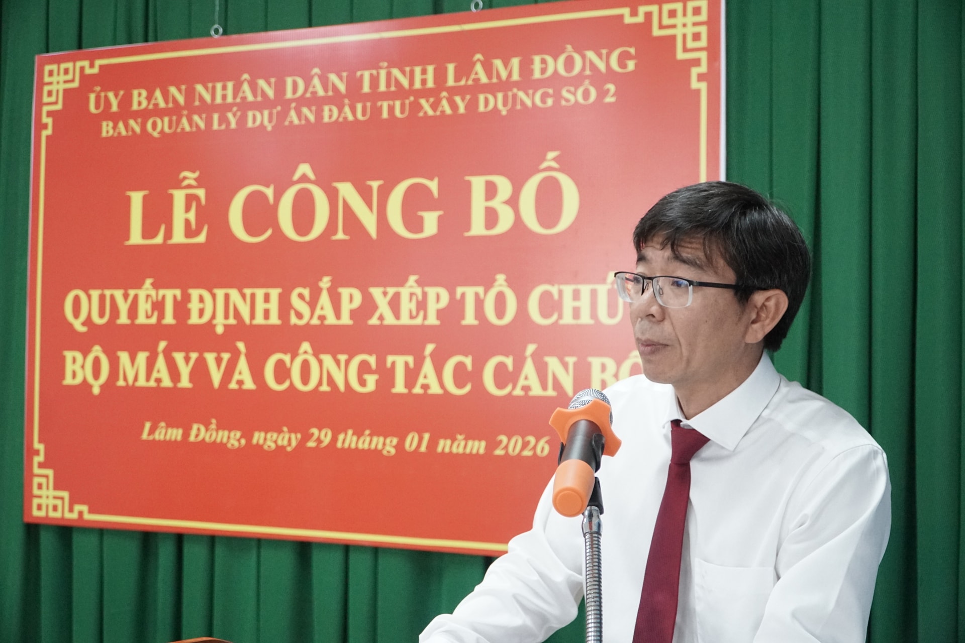 Theo quyết định của UBND tỉnh, sáp nhập Ban Quản lý dự án Nông nghiệp tỉnh Lâm Đồng và Ban Quản lý dự án Giao thông tỉnh Lâm Đồng vào Ban Quản lý dự án đầu tư xây dựng số 2, trực thuộc UBND tỉnh Lâm Đồng và chính thức đi vào hoạt động từ ngày 1/2/2026.