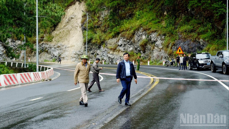 Chủ tịch Ủy ban nhân dân tỉnh Lâm Đồng Hồ Văn Mười kiểm tra hiện trường sạt lở trên đèo Prenn sáng 17/11.