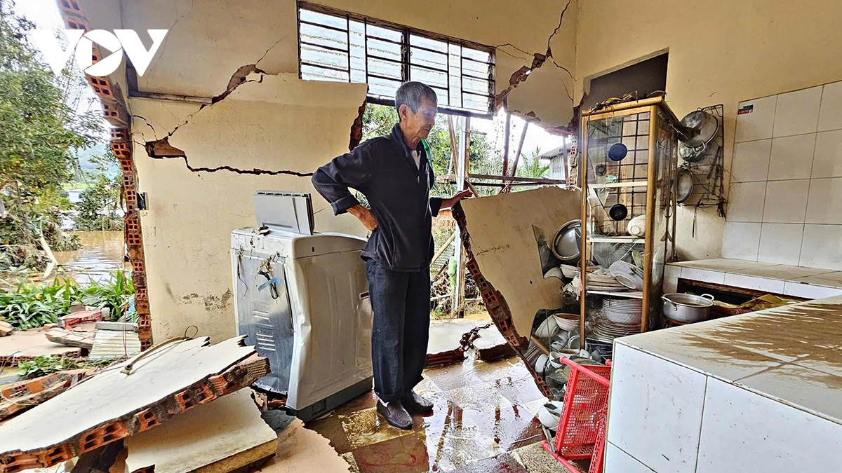 Một hộ dân đứng trong căn bếp bị sập tường, nứt toác sau khi nước lũ ào vào, cuốn trôi nhiều vật dụng, làm hư hỏng toàn bộ tài sản.