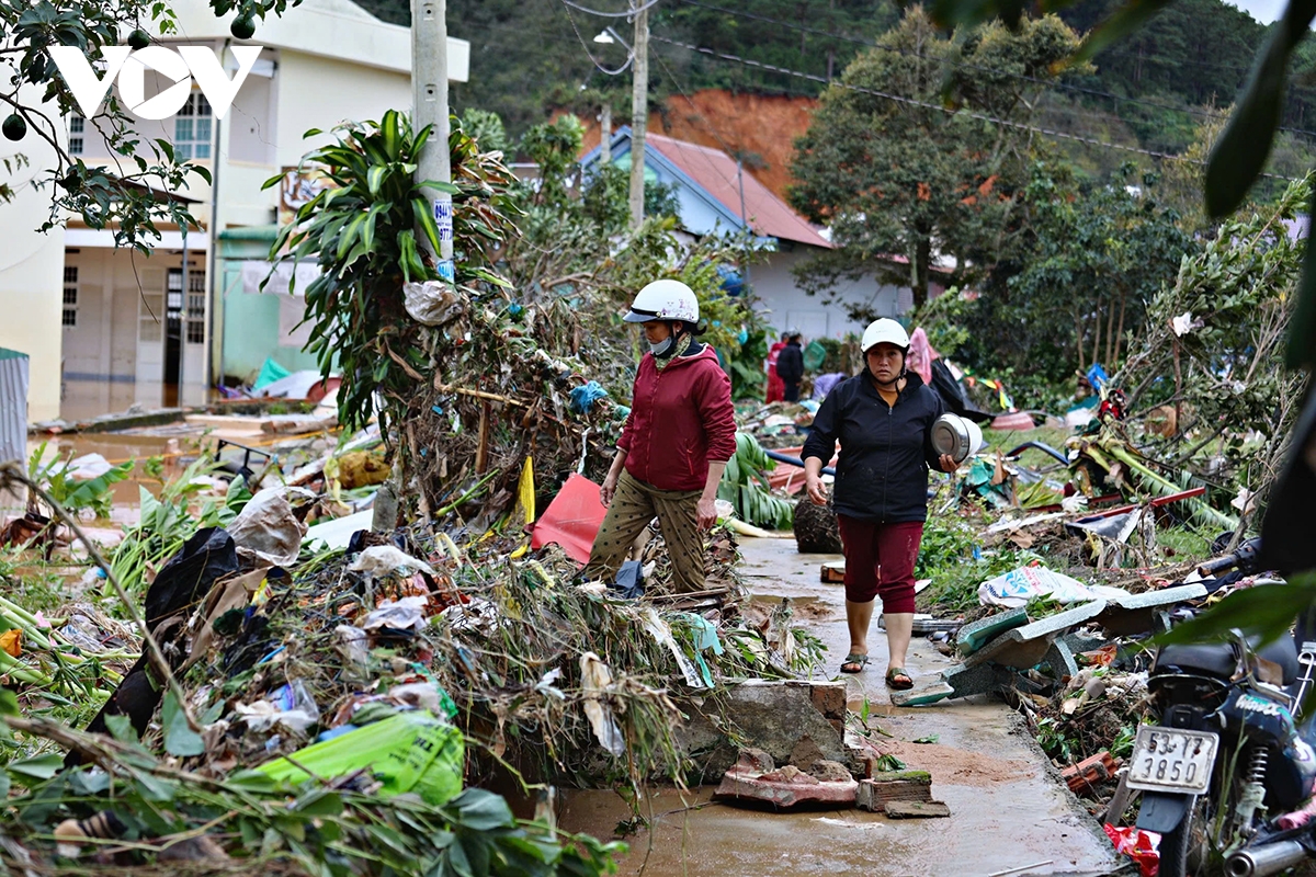 Tuyến đường liên thôn ngổn ngang cây cối, rác và đất đá; người dân D’ran nỗ lực thu dọn, tìm kiếm đồ đạc còn sót lại sau khi nước rút.